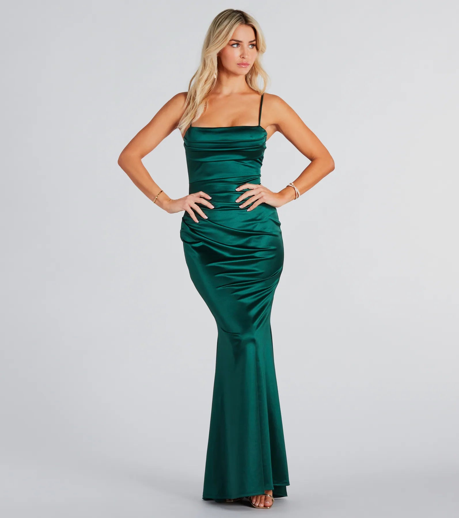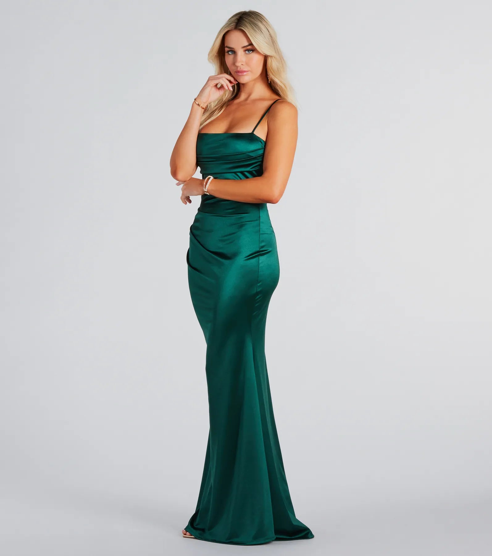 Feel graceful in the Teagan formal satin long dress to add a touch of luxury at banquets or black tie weddings! A perfect choice for a special occasion. she features a square neckline. spaghetti straps. a pleated bust. and a flattering mermaid silhouette with a floor-length hem. The soft and luxurious satin fabric elevates your look and offers minimal stretch. Complete the look with a and earrings.