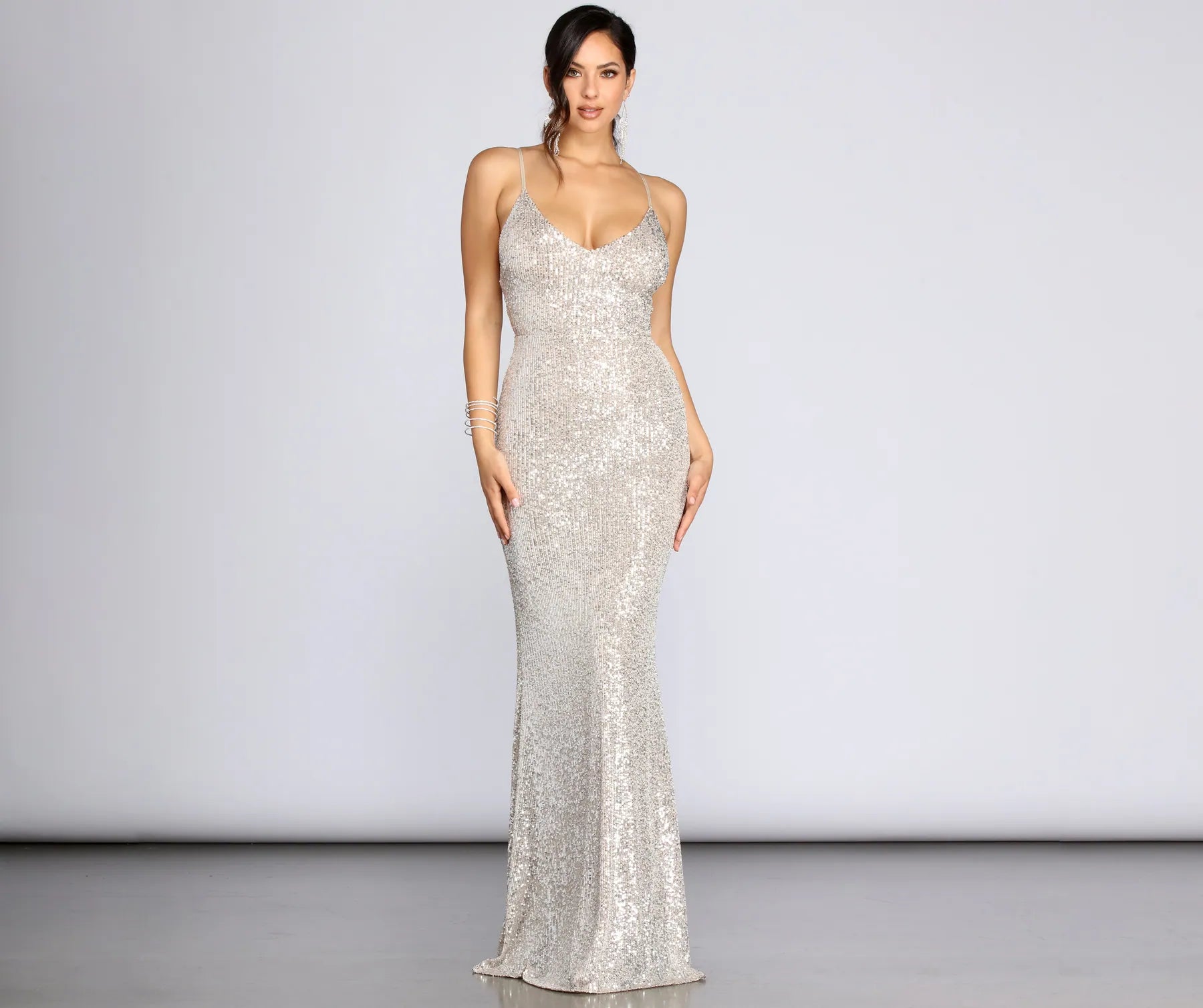 Make our glittering dreams come true in the beautiful Teagan sequin gown! Her fit is curve hugging in all the right ways. she has a V neckline. spaghetti straps that are adjustable and lead to a low back line. Her hem sweeps the floor in a dreamy way. She is composed of a knit sequin fabric that offers moderate stretch. Showcase that hourglass shape in this showstopper!