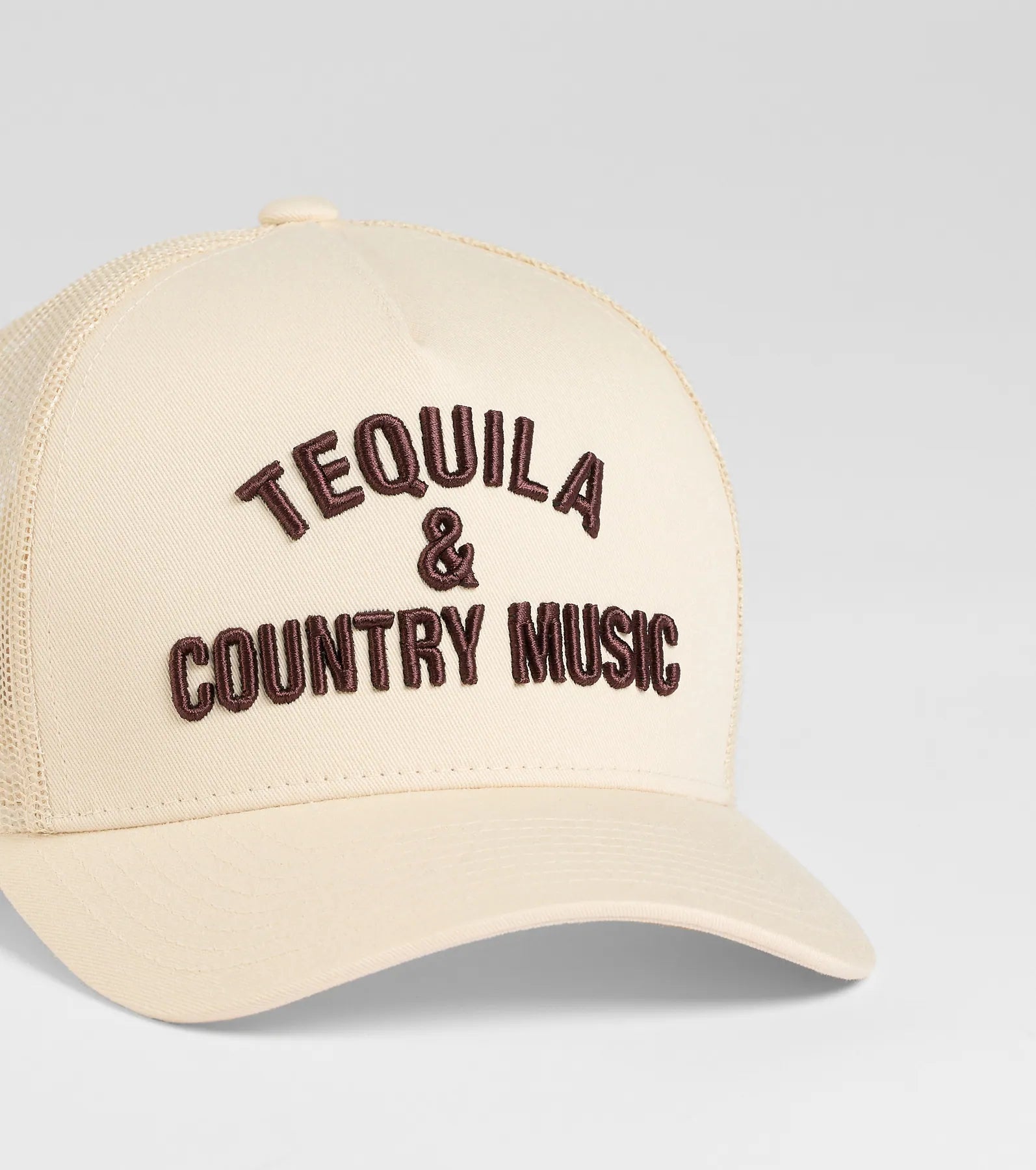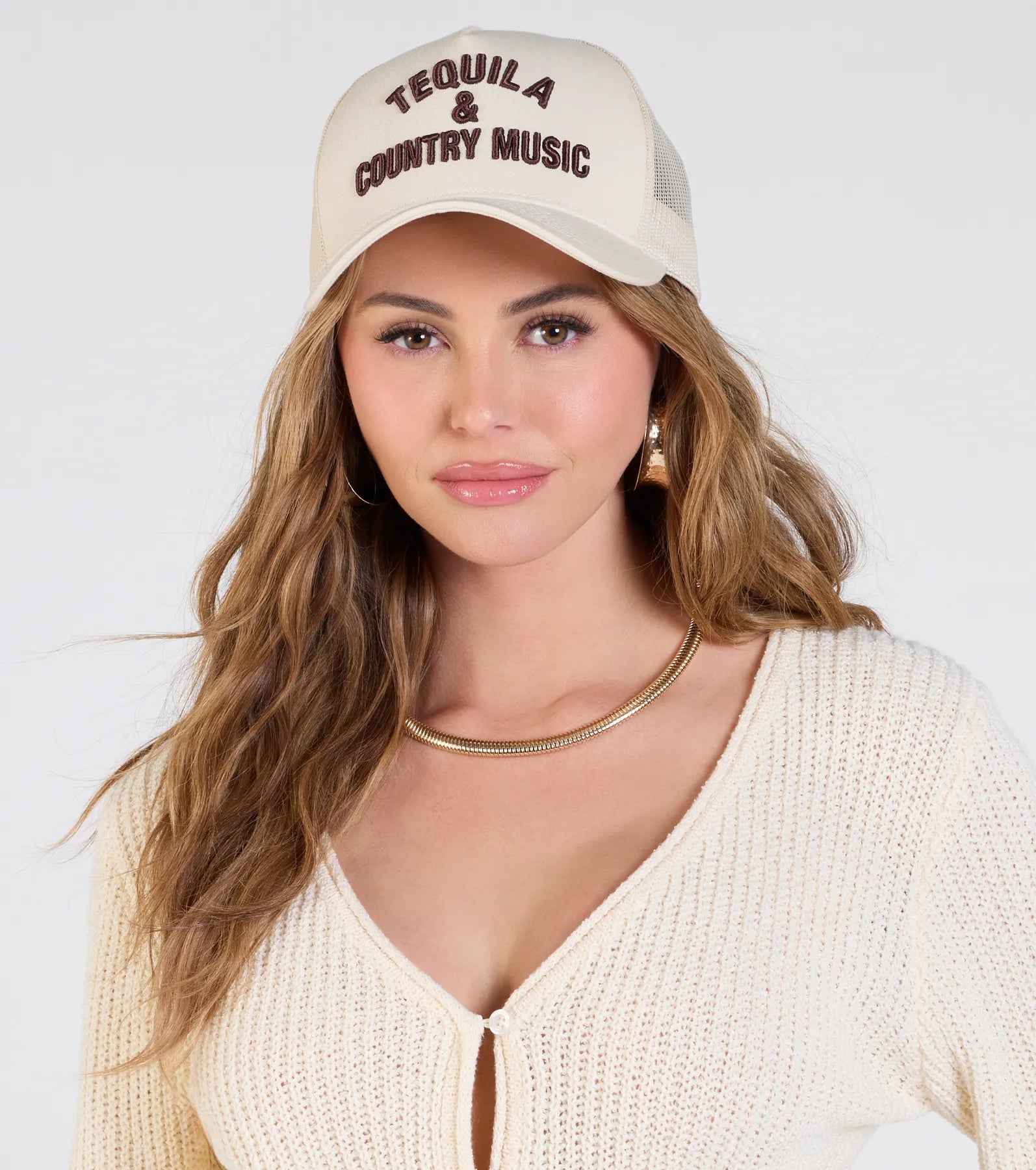Let this trucker hat do the talking at festivals and concerts! It boasts a front embroidered script that reads Tequila And Country Music and an adjustable snap back closure for a snug fit.