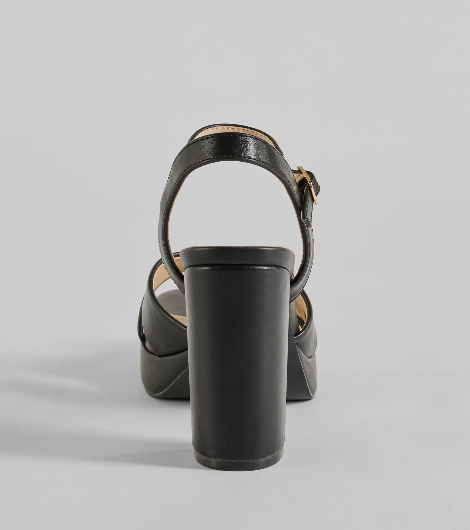 These faux leather heels are a timeless treasure! Featuring a stylish square toe and criss-cross straps. these heels provide a luxe fit with a cushioned insole. The adjustable ankle strap with buckle closure and platform sole adds stylish height and a secure fit. Complete the look with a chic .
