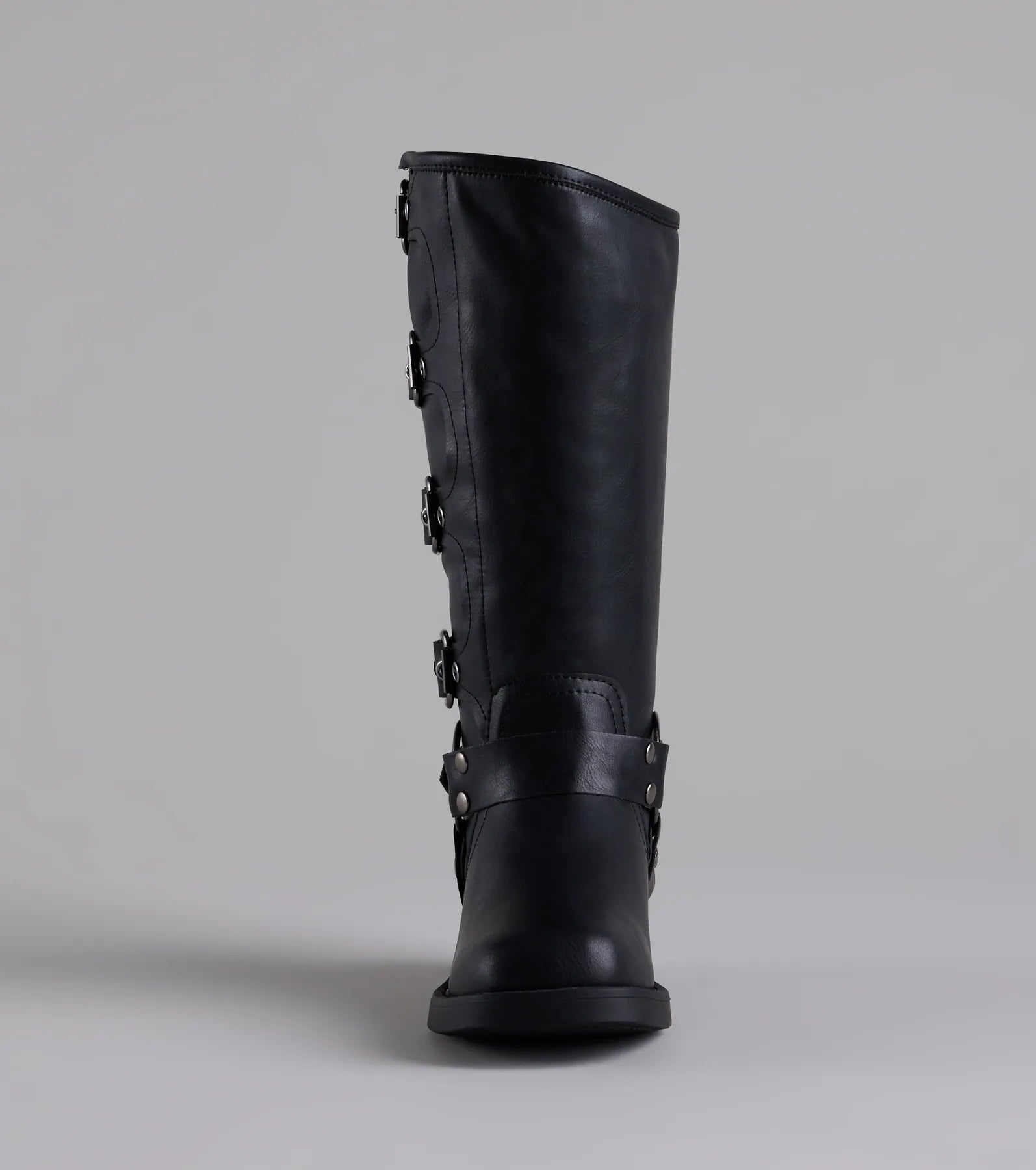 Step into these edgy statement faux leather boots with a buckled side accent and a calf-length fit perfect for pairing with bottoms or dresses.