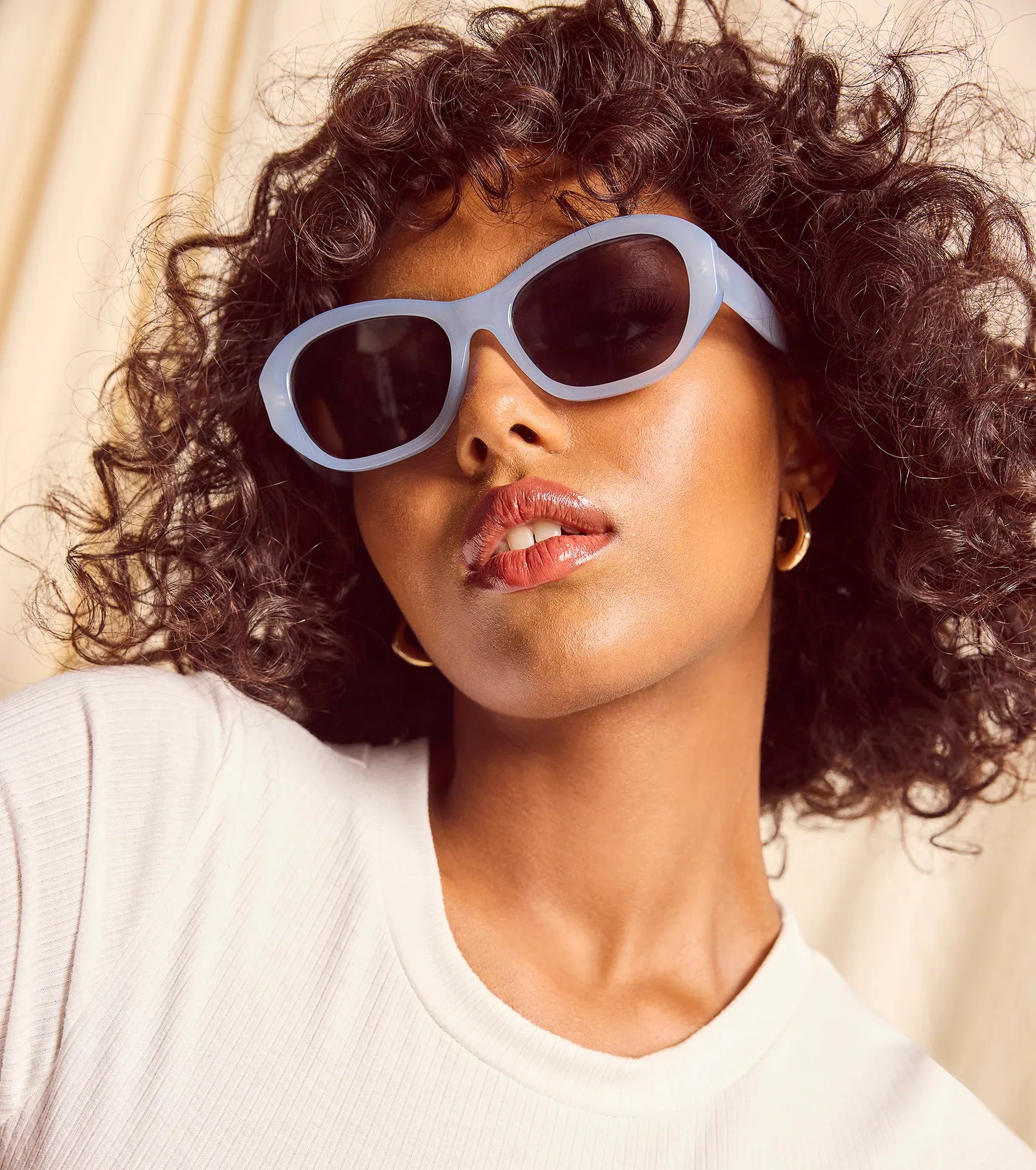 Level up the trend factor of your summer looks with these cool shades. The sunglasses feature an angled oval-shaped design with a translucent plastic frame. built-in nose pads. and tinted lenses. Pair with a and sneakers.