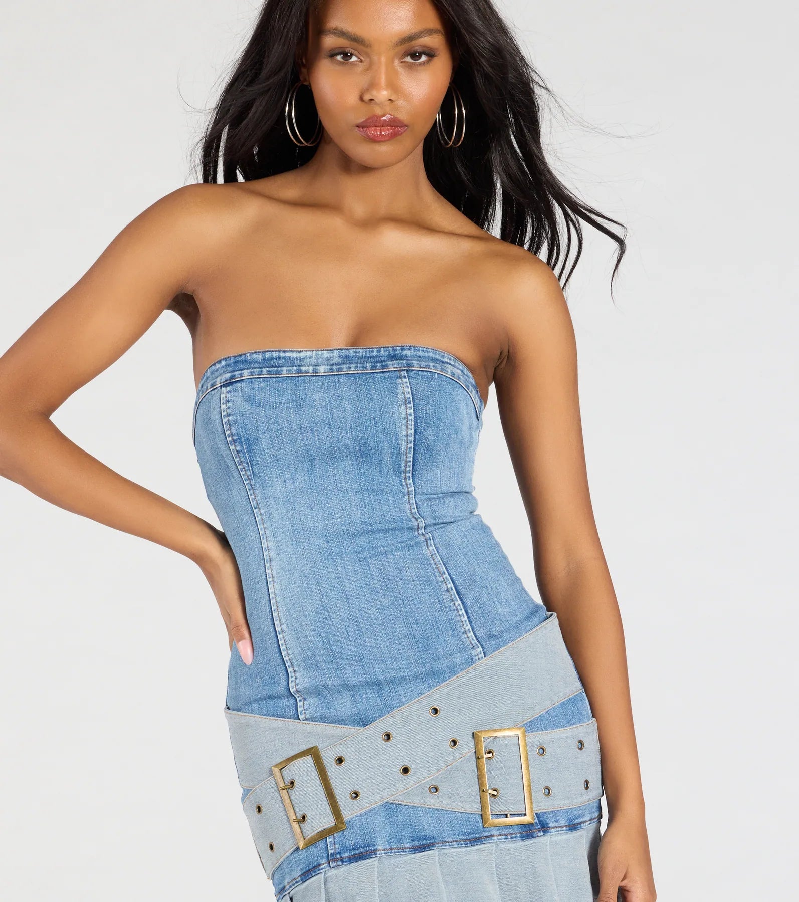 Hit the streets in this of-the-moment denim mini dress with a trendy belted design and flirty pleated hem!