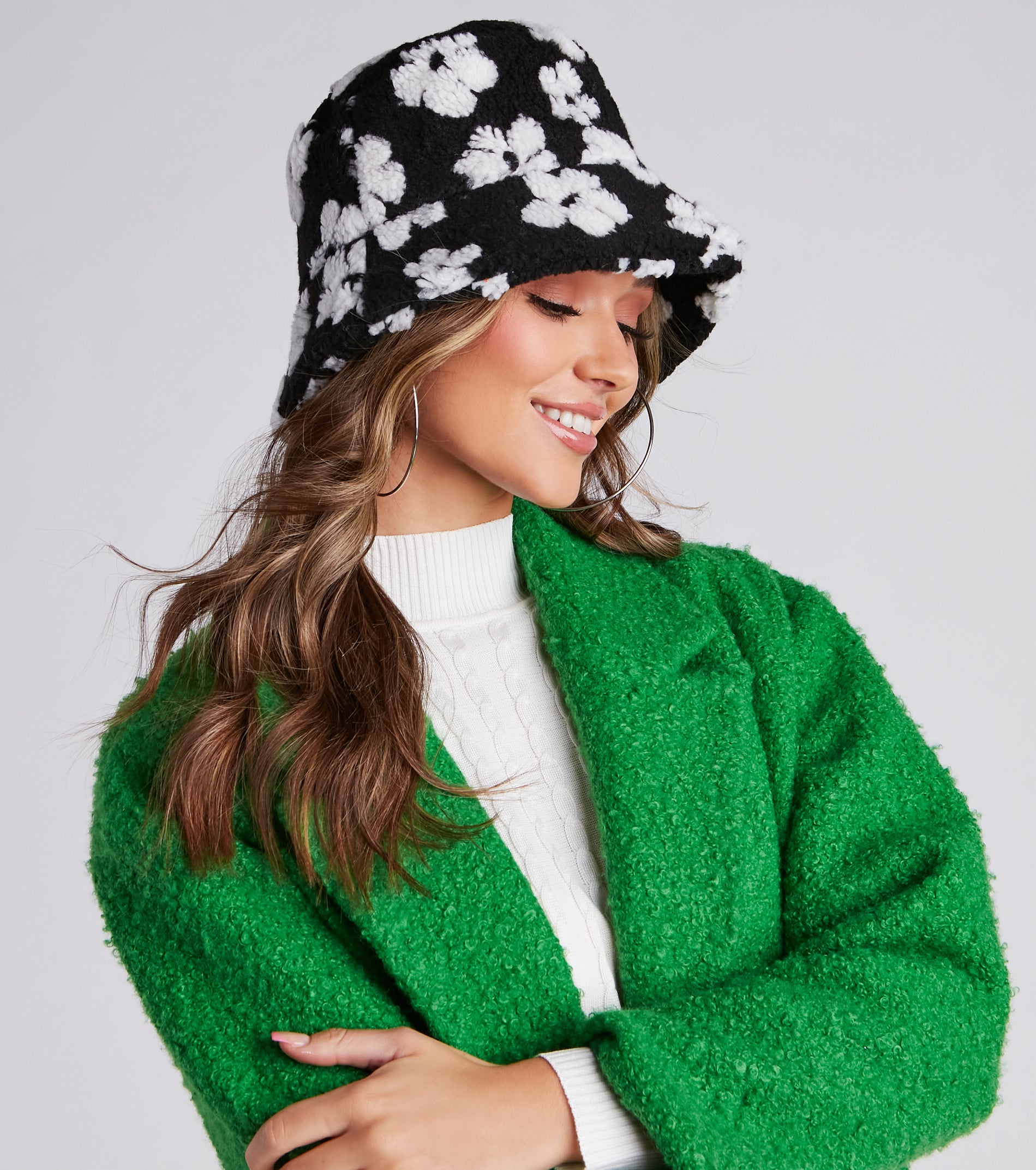 Top off your everyday ‘fits with this adorable floral bucket hat! Featuring a short brim with an all-over flower pattern and a cozy faux sherpa material. this hat will make you a trendsetting cutie! Style with your fave .