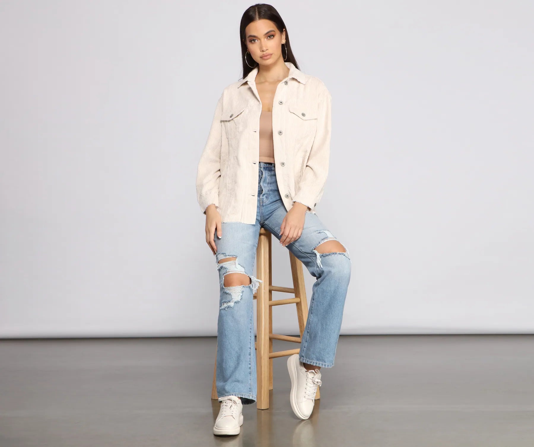 Layer on this corduroy shacket to give your look a trendy vibe. It features a collared neckline. long sleeves with single buttons to cuff. a complete button-down front. buttoned chest pockets. and a relaxed fit with frayed hems. Pair this shacket over a and accessorize with gold hoop earrings.