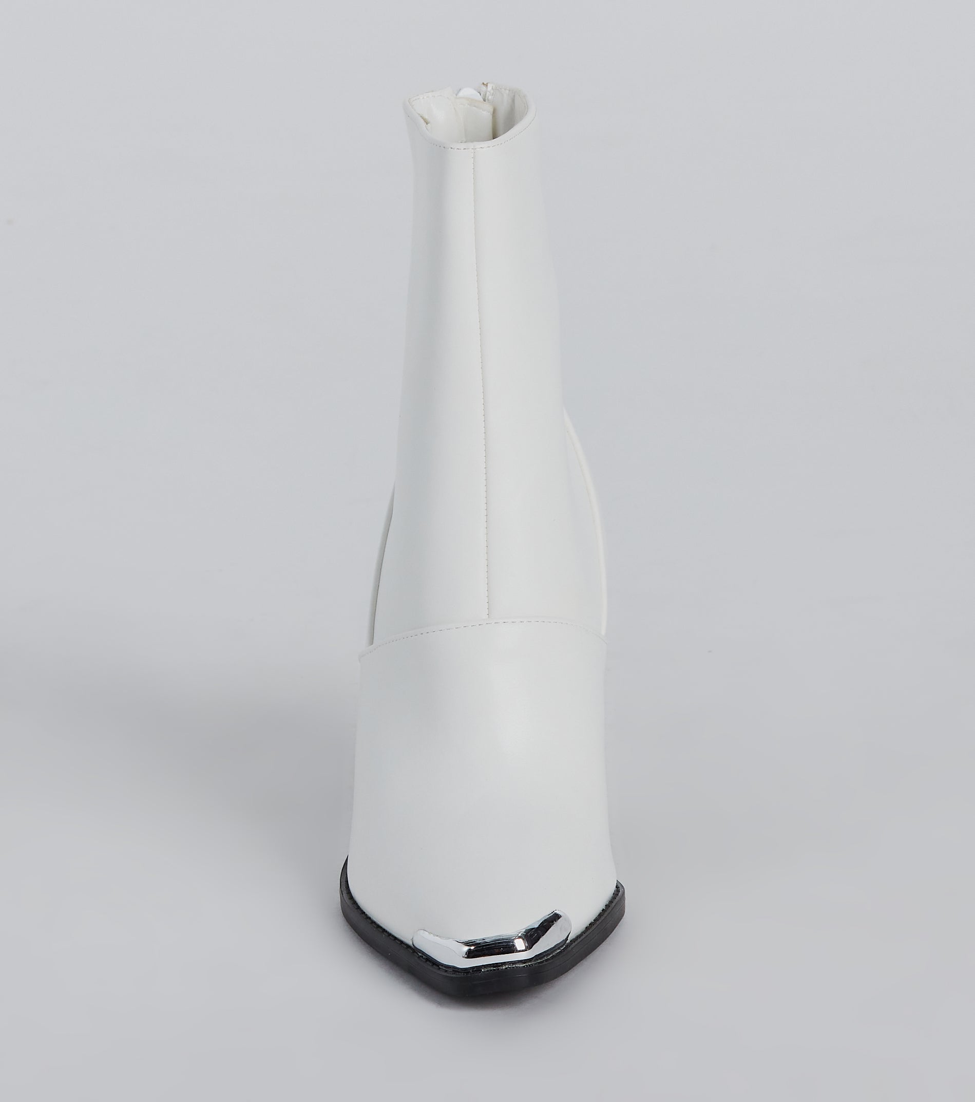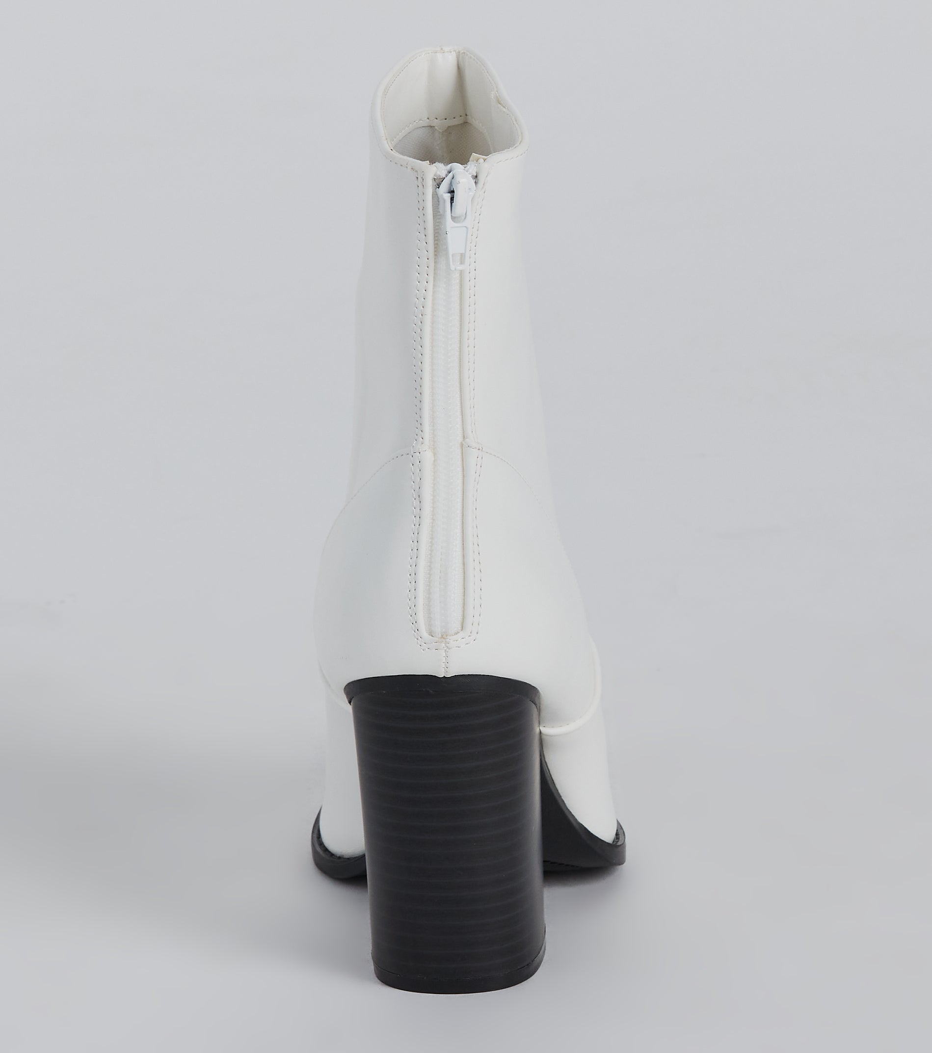 Add a trendy edge to your everyday ‘fits with these sleek faux leather booties. They feature an above-the-ankle height. a chic asymmetric stitched design. a square-shaped toe with a shiny metal toe cap. a back zipper closure for easy on-and-off styling. and a stacked block heel. Pair these boots with .