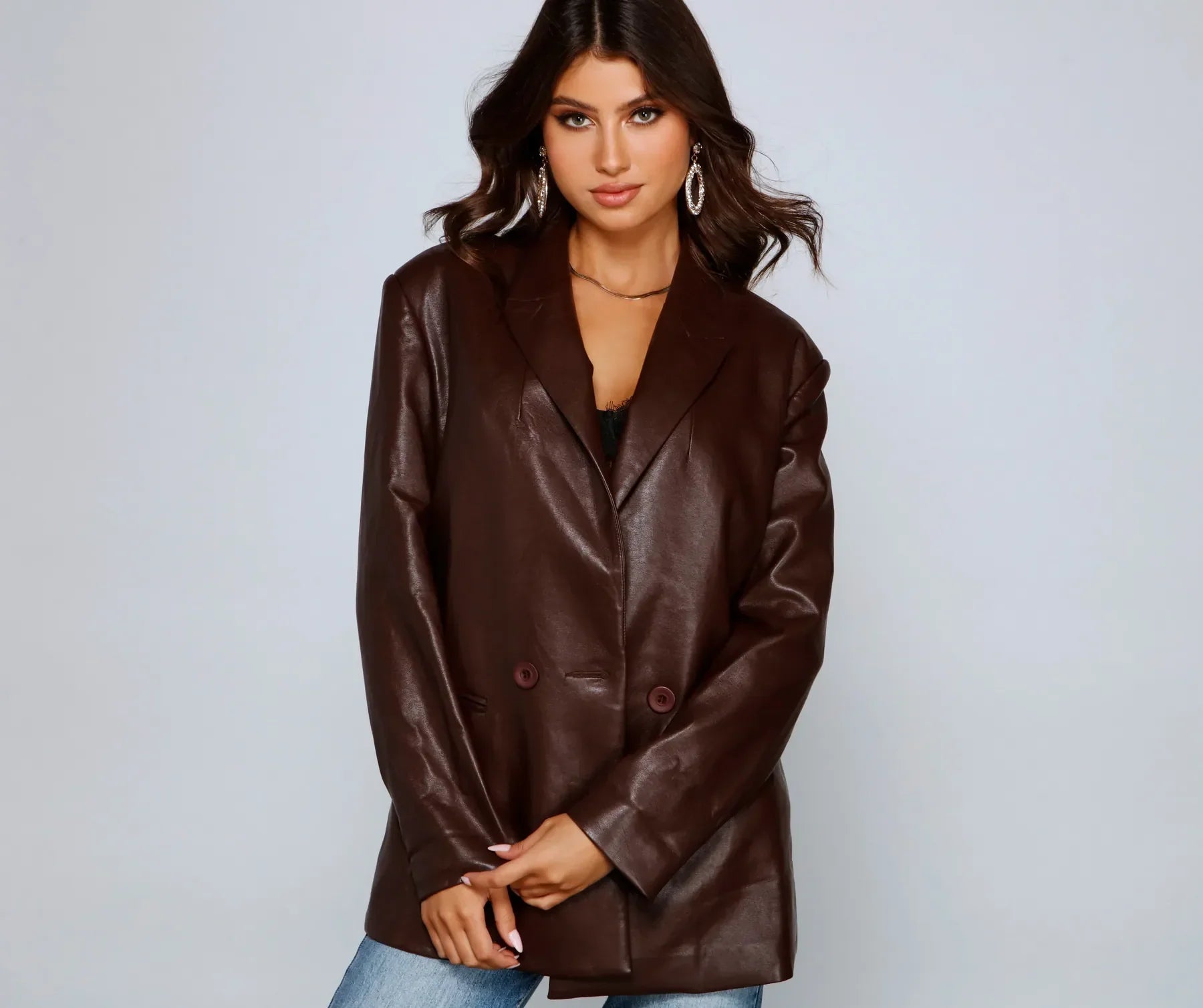 Keep it trendy with a blazer that layers on the style! The blazer features a collared neckline with lapel accents. a double-breasted button design. lightly padded shoulders. long sleeves. faux front pockets. and a long hem. The blazer is composed of a lined faux leather fabric that offers a relaxed fit with minimal stretch. Complete the look with a and high waist pants.
