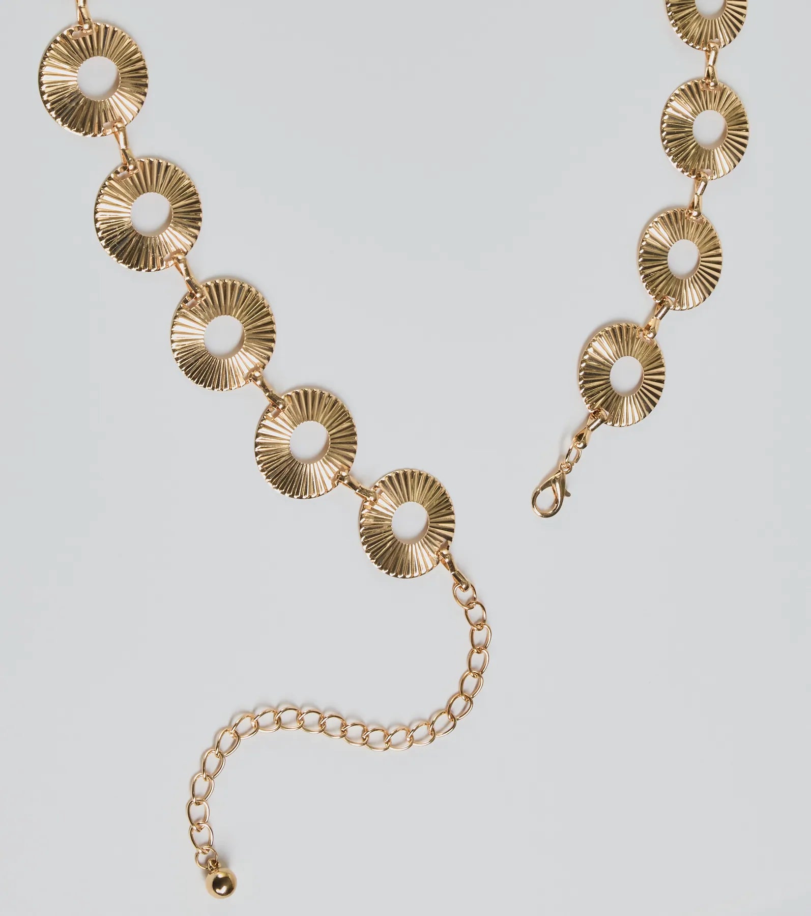 A chain belt featuring etched oval discs and a secure lobster clasp closure. Style with a flared skirt or jeans for the perfect outfit.