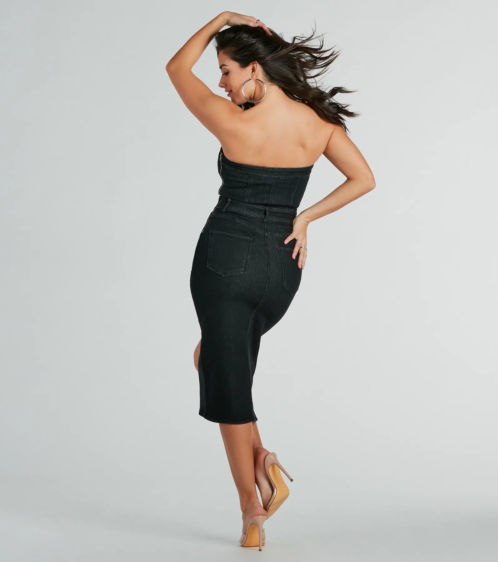 You’ll be the topic of conversation in this denim midi dress for the trendiest look at casual hangs or brunch! This stunning denim dress features a strapless neckline and a form-hugging silhouette that will accentuate your curves. The belt loop accents and four-pocket styling add cute functional details. while the front center slit and midi-length hem provide a modern touch. Complete the look in sleek and pumps!