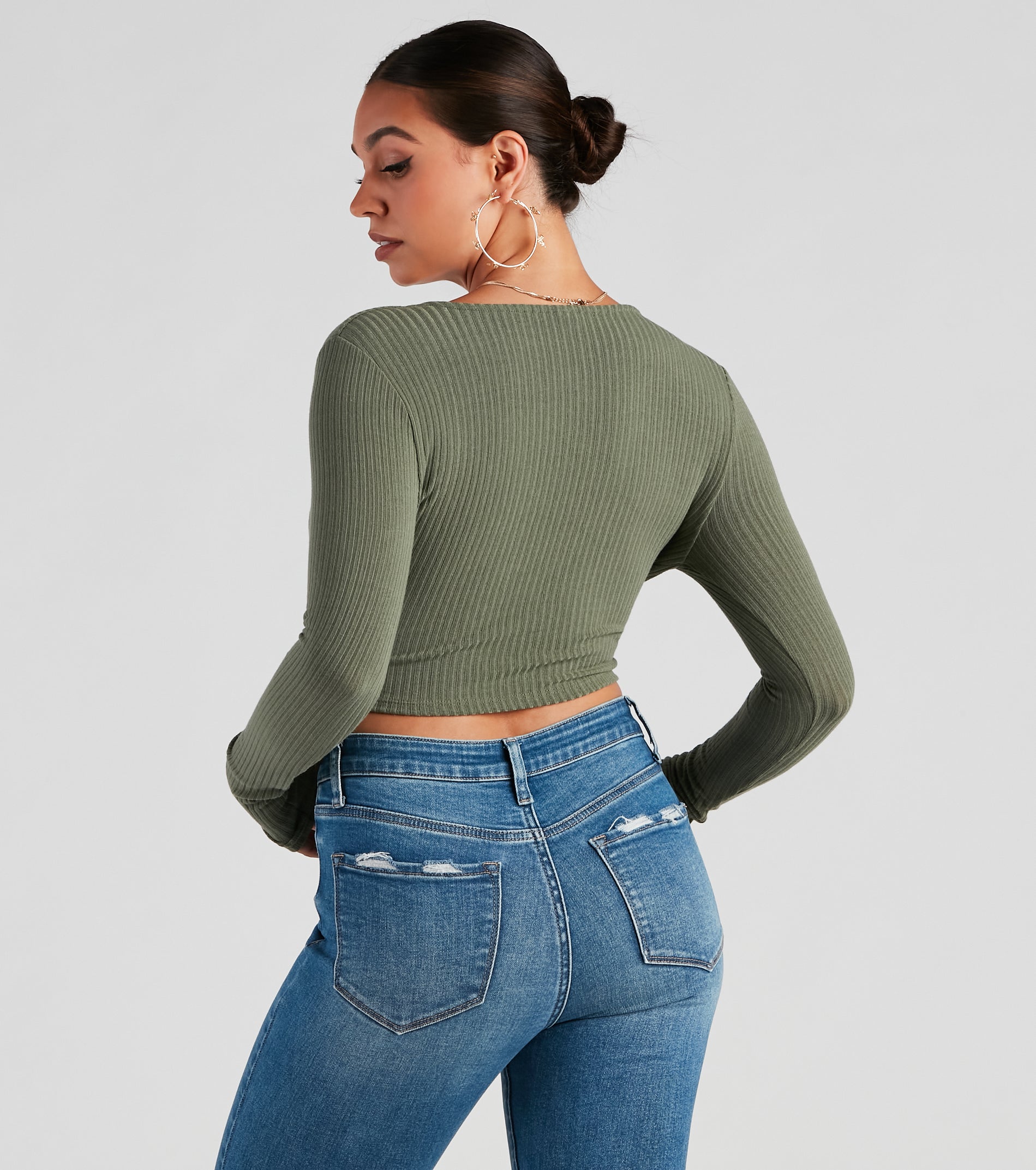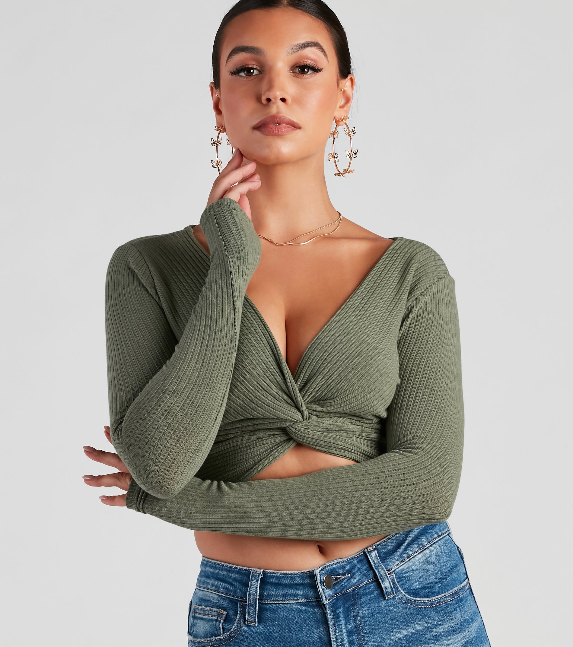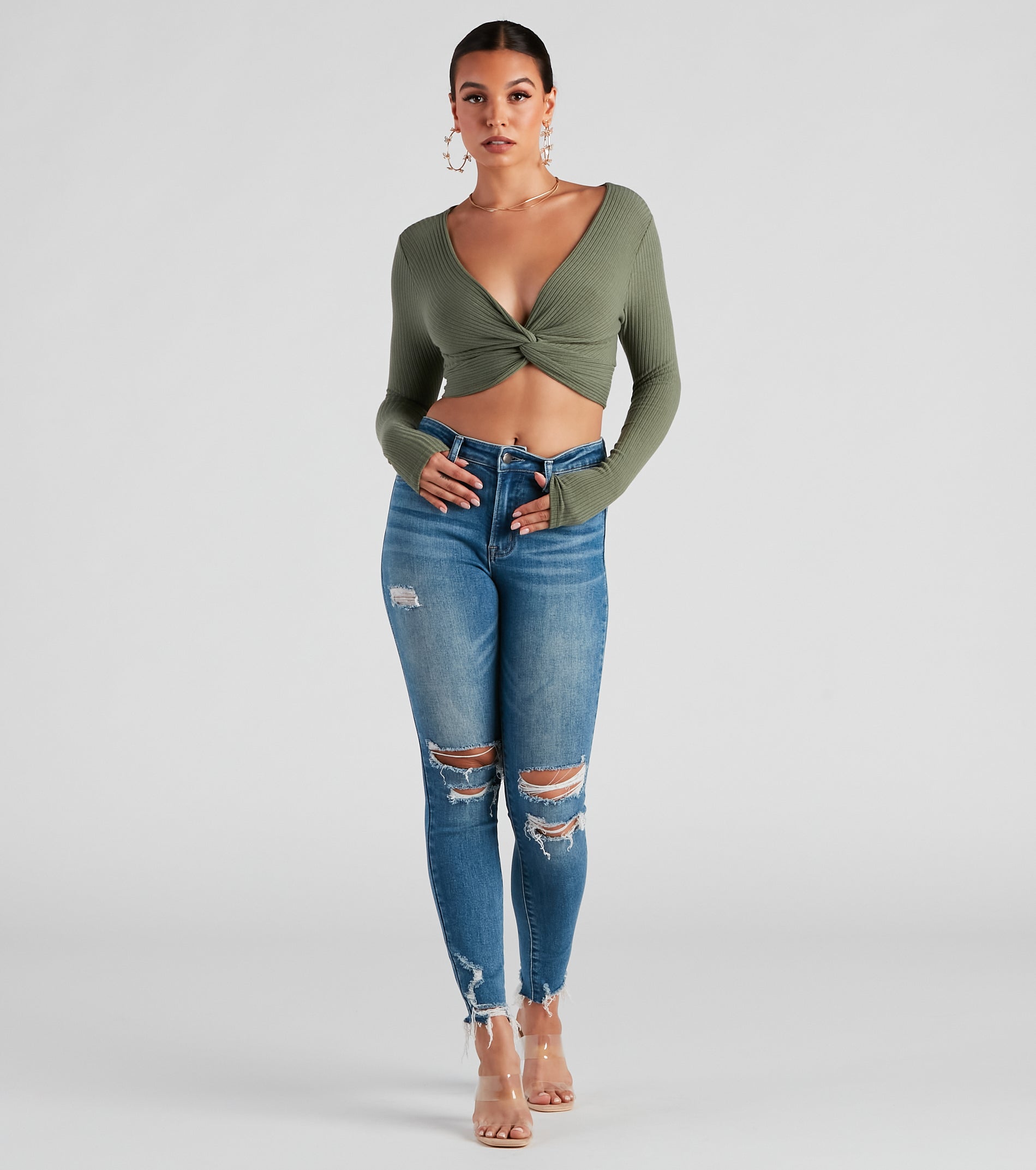 Stay on trend this fall with this elevated basic! The crop top features long fitted sleeves. a deep V-neckline with a twist-front design. and a cropped. form-hugging fit. Style with and booties.