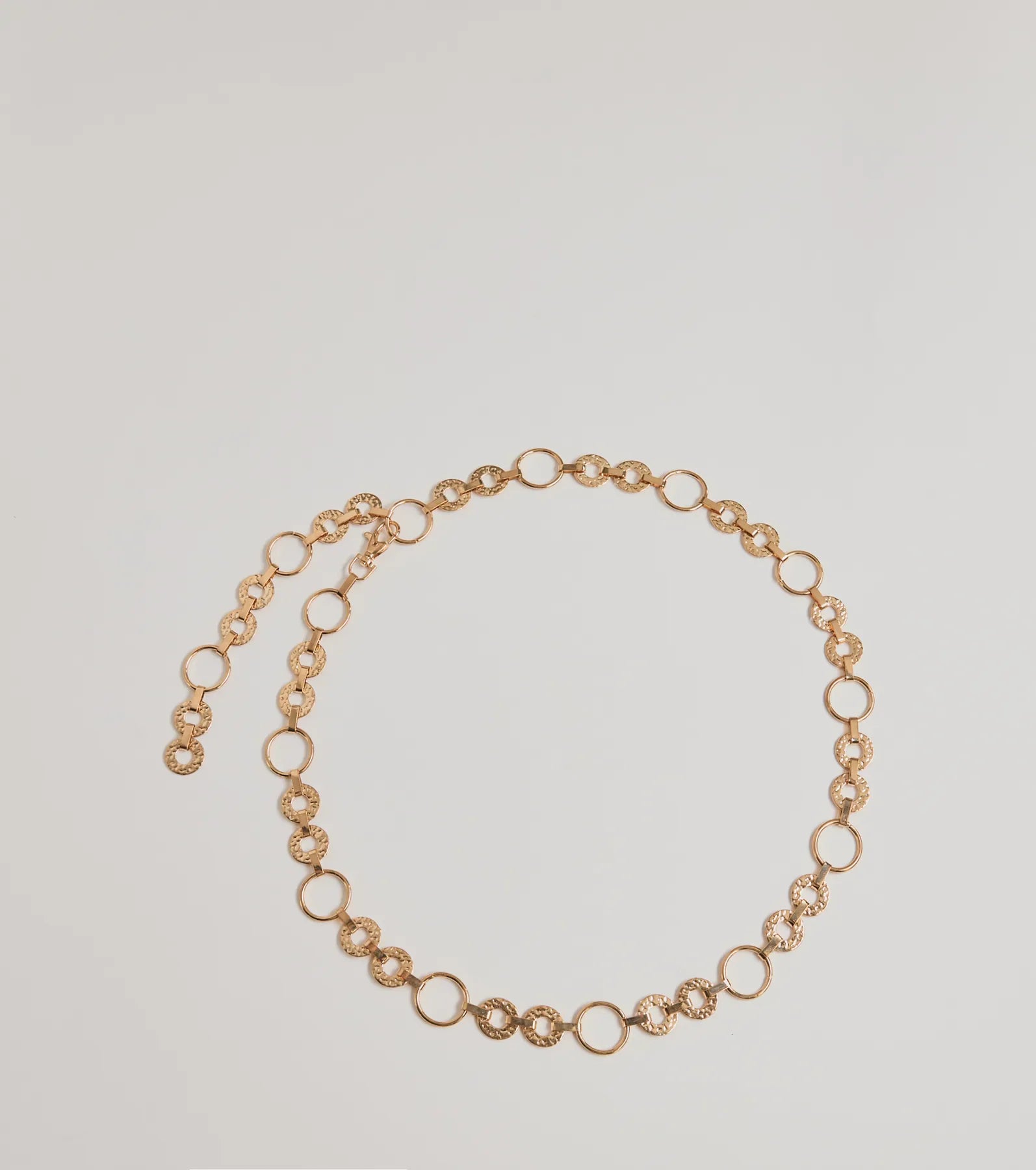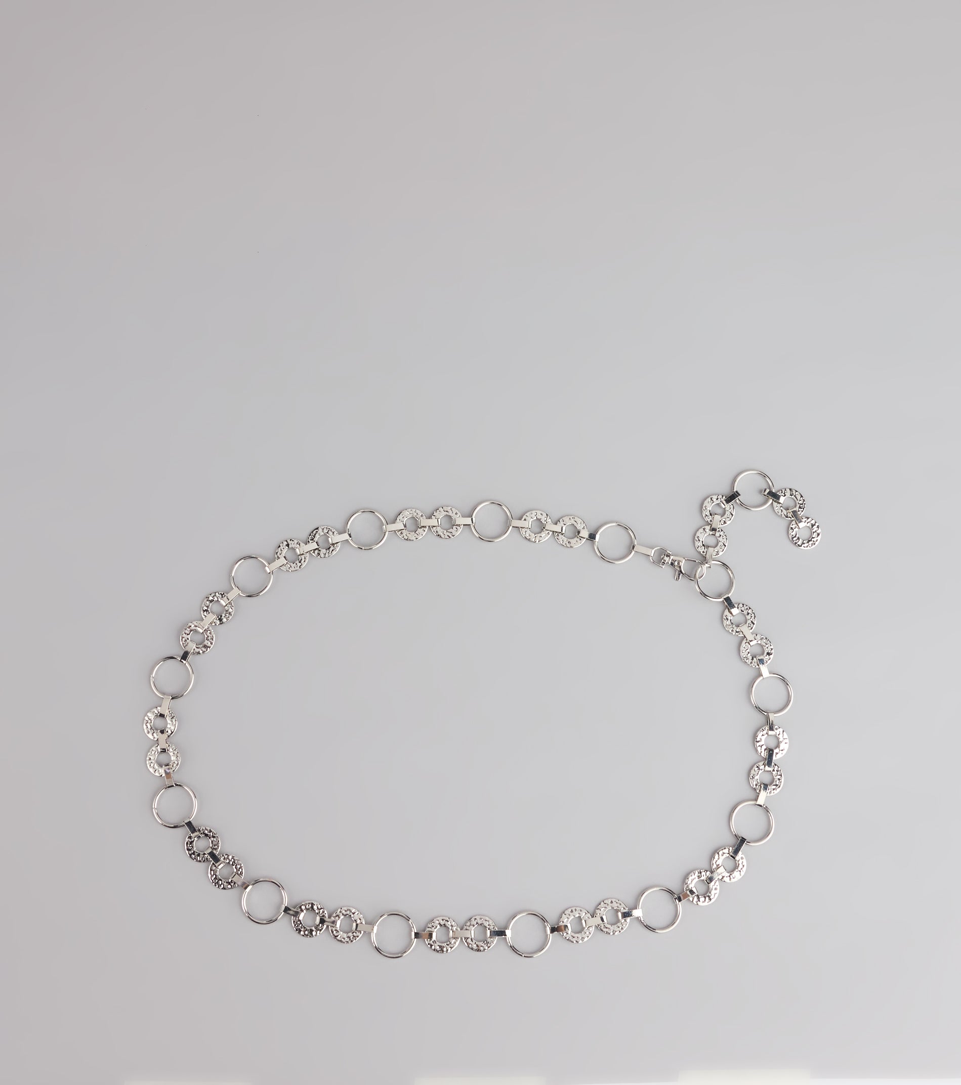 Achieve a trendy vibe accessorizing with this textured O-ring chain belt secured with a lobster clasp closure. Pair with a mini skirt.