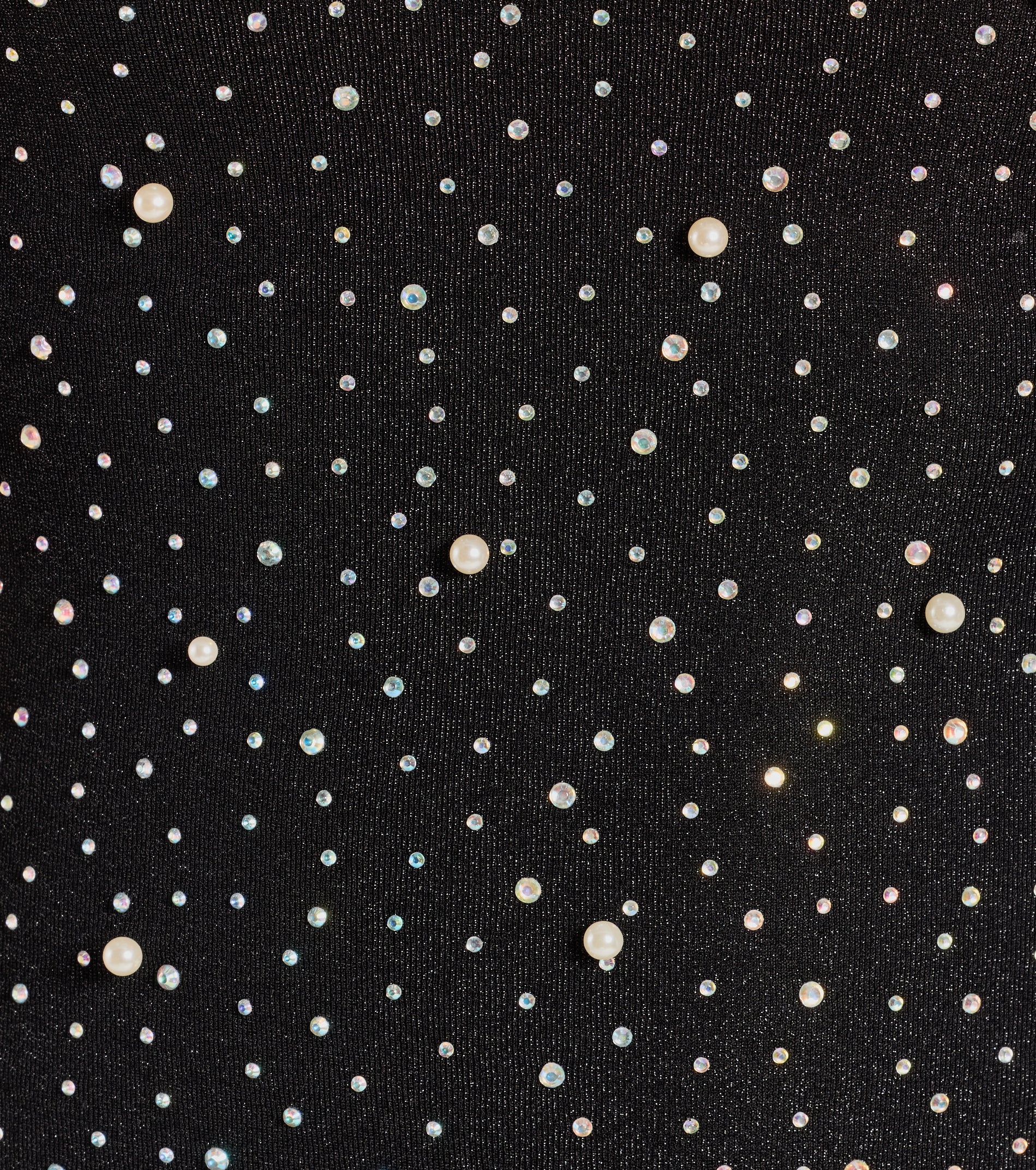 A luxe strapless dress features countless faux pearls and rhinestone embellishments on a flattering bodycon mini-length silhouette. Perfect for homecoming or dressy parties.