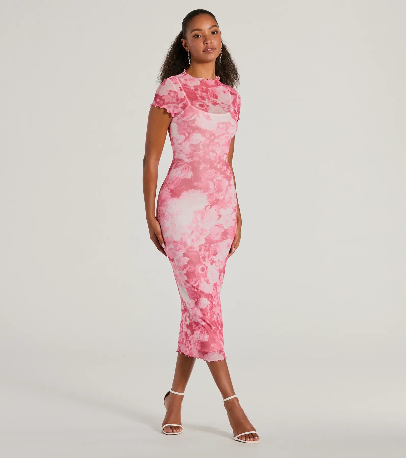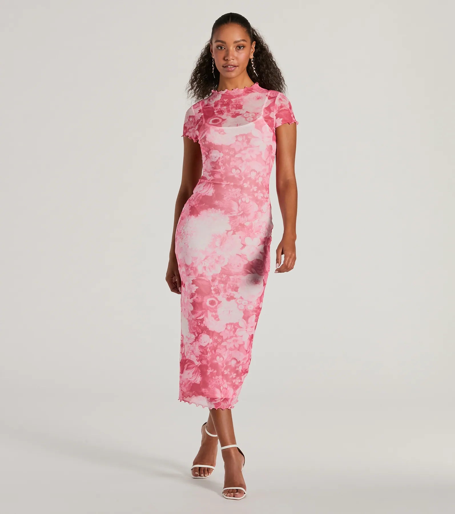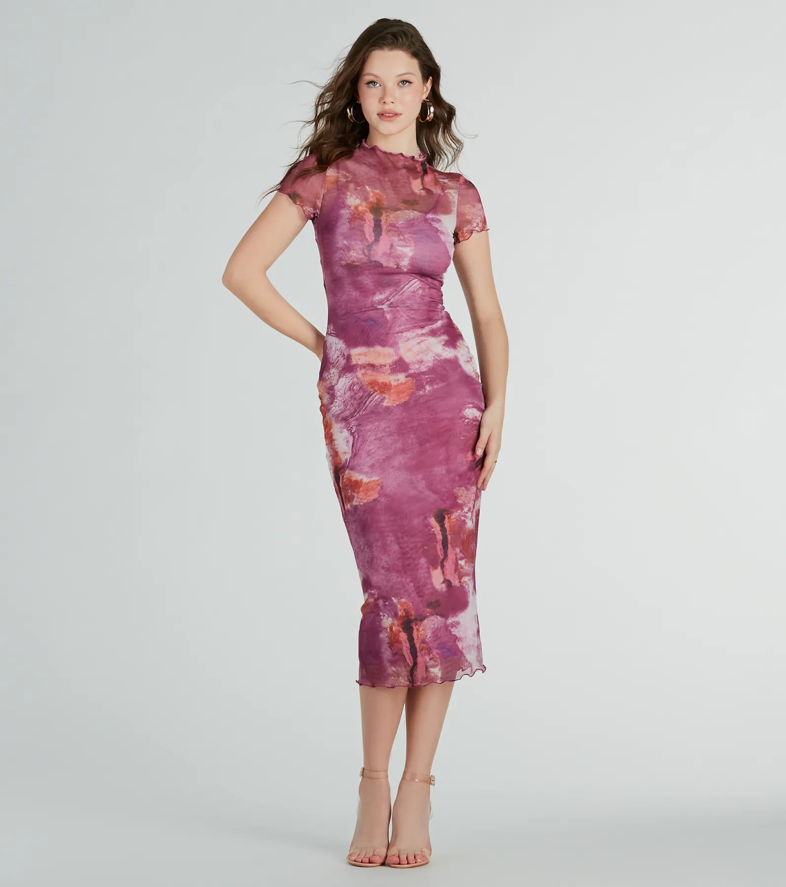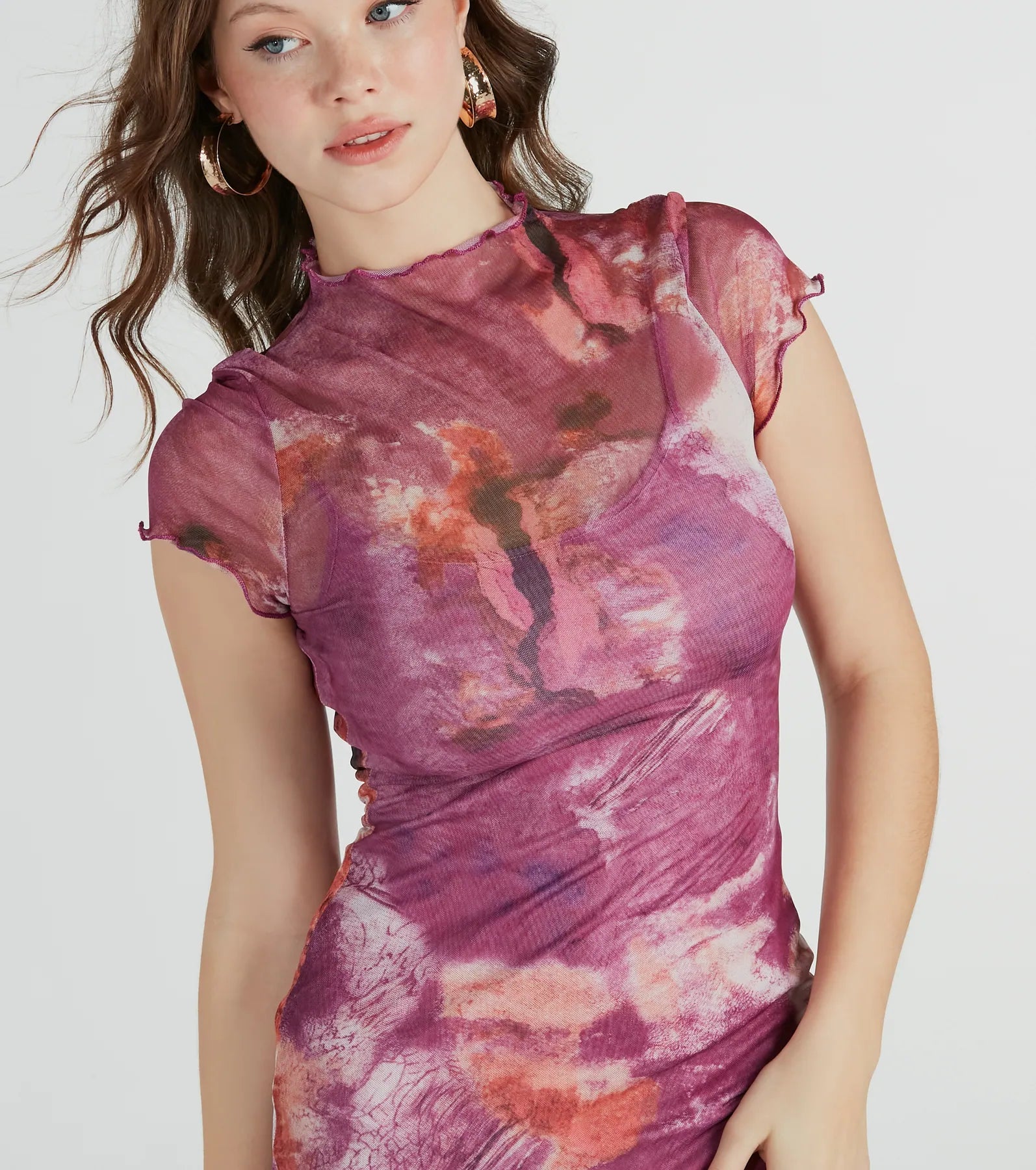 Showcase your unique style in this artsy abstract print maxi dress for a gallery opening or a wine bar! It features cap sleeves. a mock neck. and a bodycon silhouette. The dress is composed of a sheer mesh fabric with a stretchy knit maxi slip lining with adjustable spaghetti straps. a scoop neck. and a fitted hem. Complete the look in .
