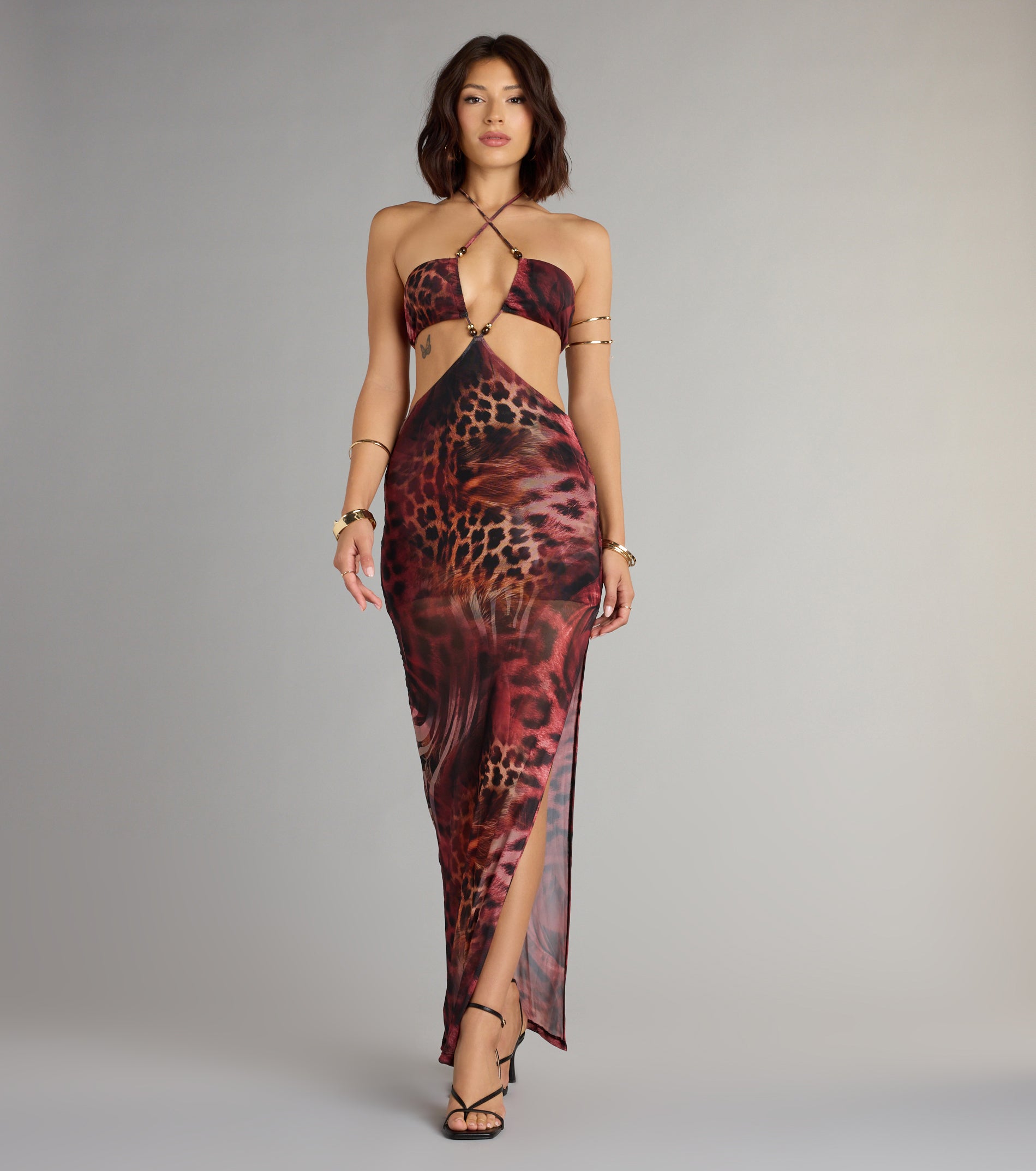 For the nights you want all eyes on you. This sultry animal print cutout maxi dress hugs every curve and serves bold. untamed allure to keep you as the main focus.