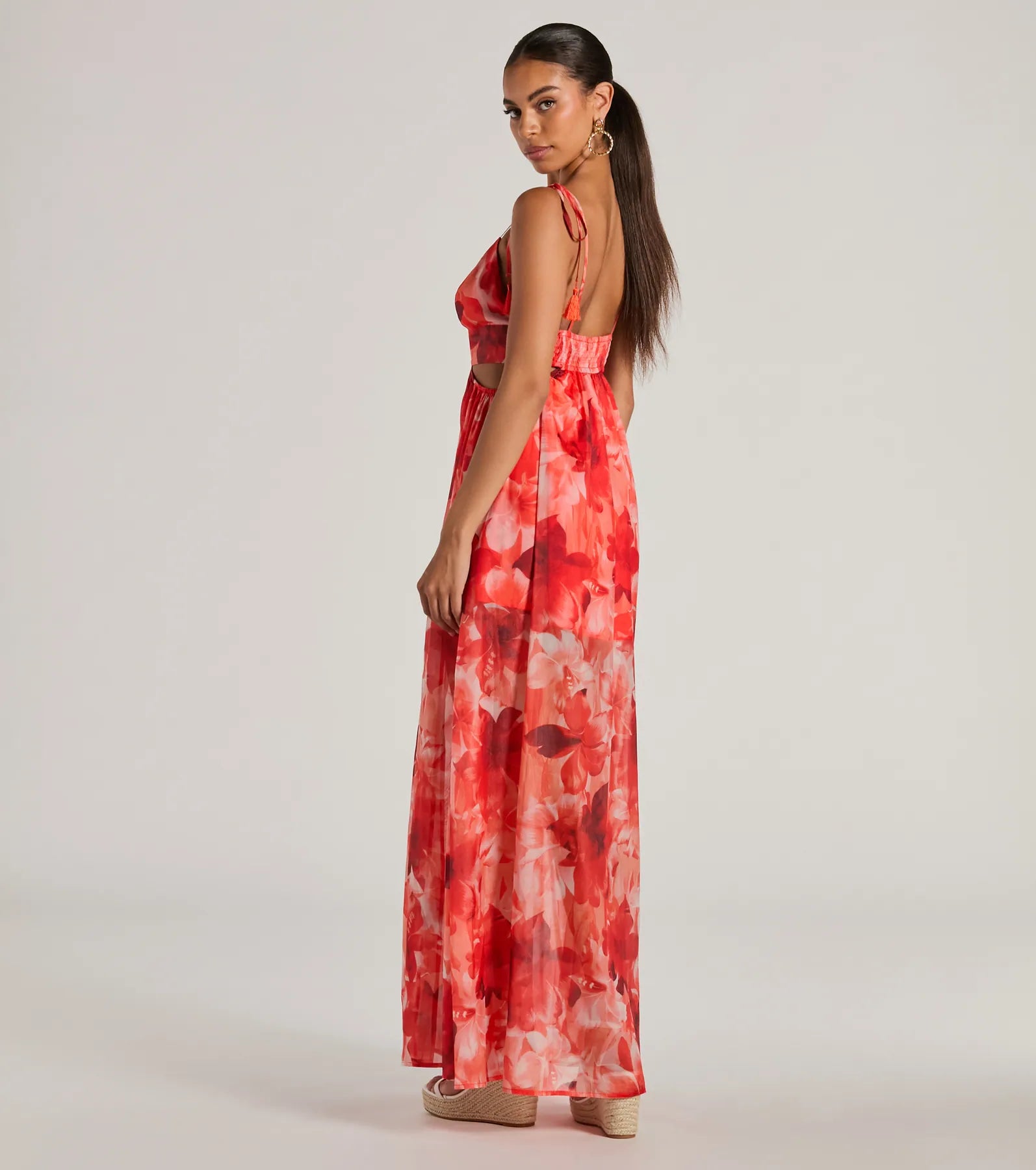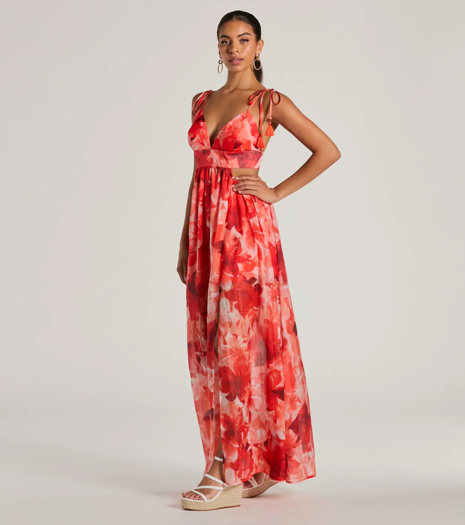 Book those tickets and pack a bag cause vacation is calling and this floral tropical maxi dress is ready to answer! Made from an airy floral tropical printed chiffon fabric with a short woven lining. this dress is perfect for summer days. Featuring spaghetti strap tassel ties and V-neckline. cutout sides add a touch of flirty fun. while the flowy maxi-length silhouette and front slit provide style. Complete the look with a and sandals!