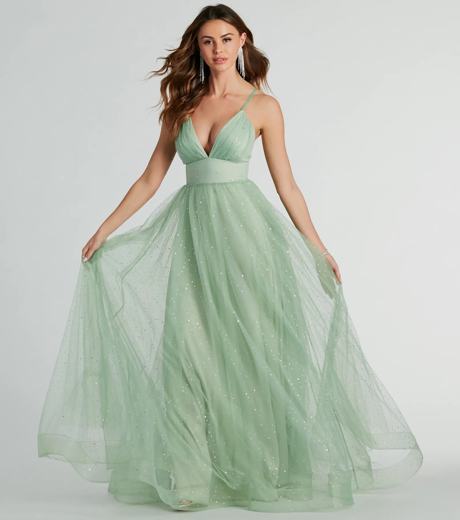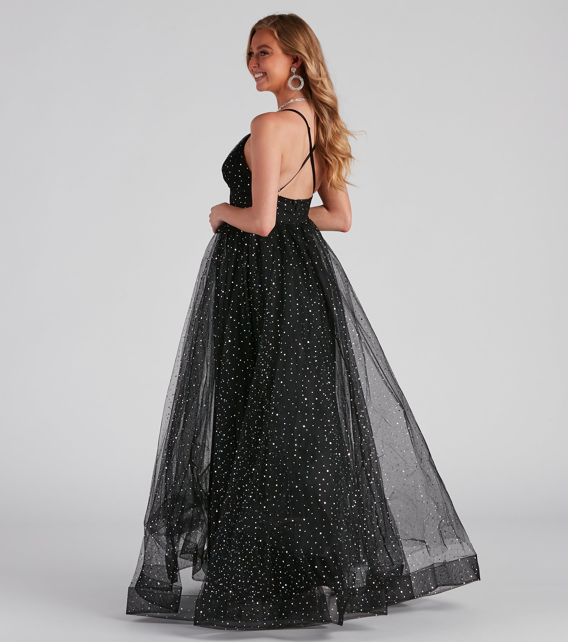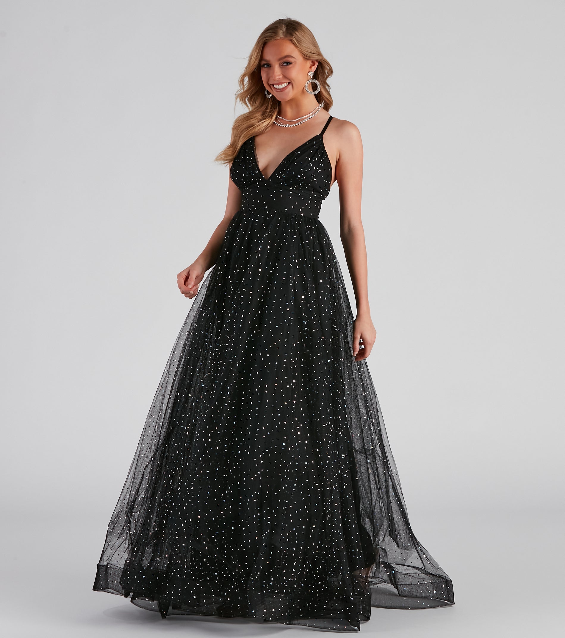 This prom season. you’ll for sure bring that dramatic flair with every step in our glam Vanessa tulle gown! She features a sleeveless plunging V-neckline with pleated detailing at the bust. adjustable spaghetti straps that lead to a cross-back design. a high waist seam. and a floor-length flowy ball gown silhouette. The dress is composed of layers of chic tulle with a knit lining and showcases all-over iridescent sequins for the prettiest sparkle. Style this dress with the perfect pair of .