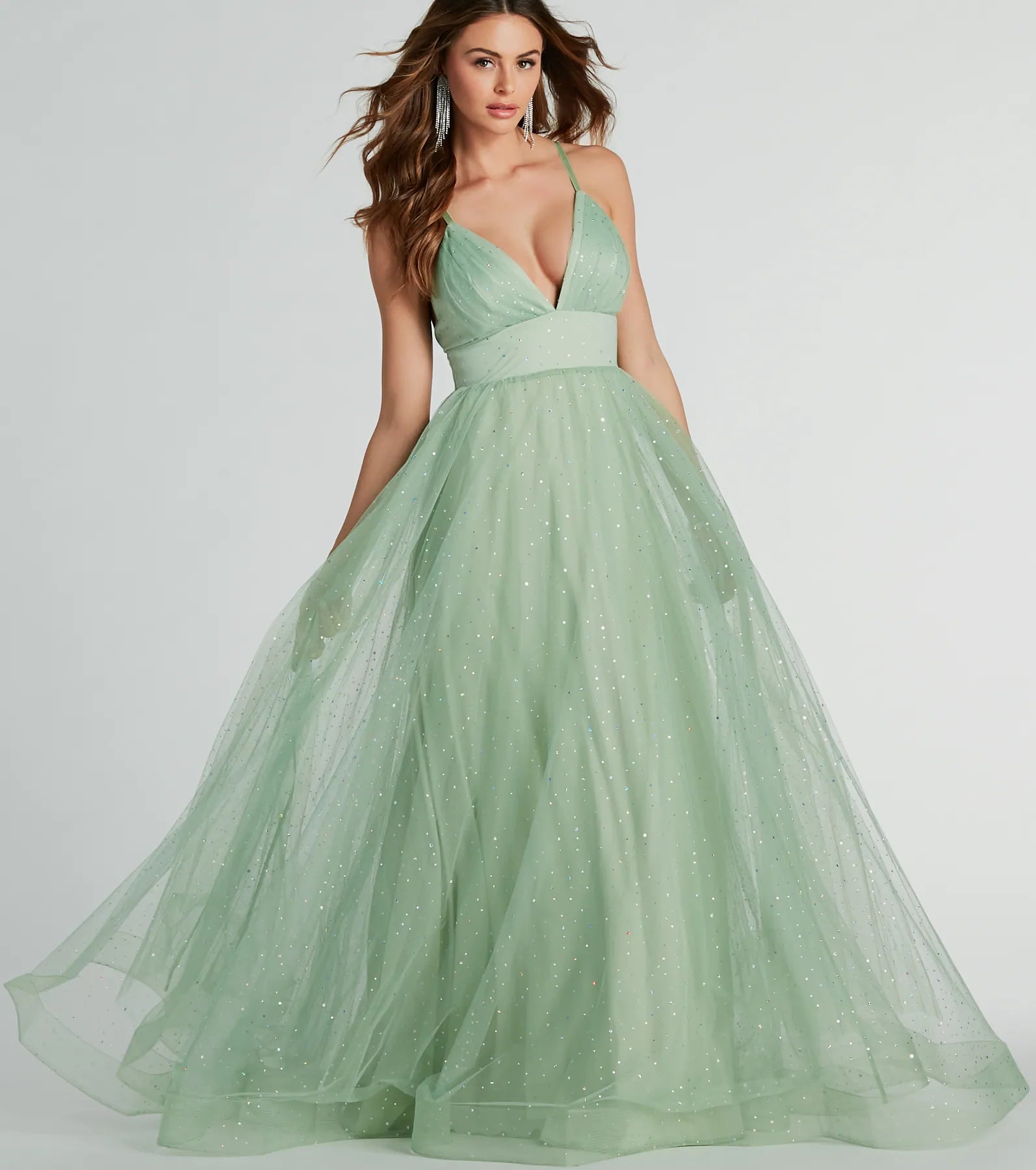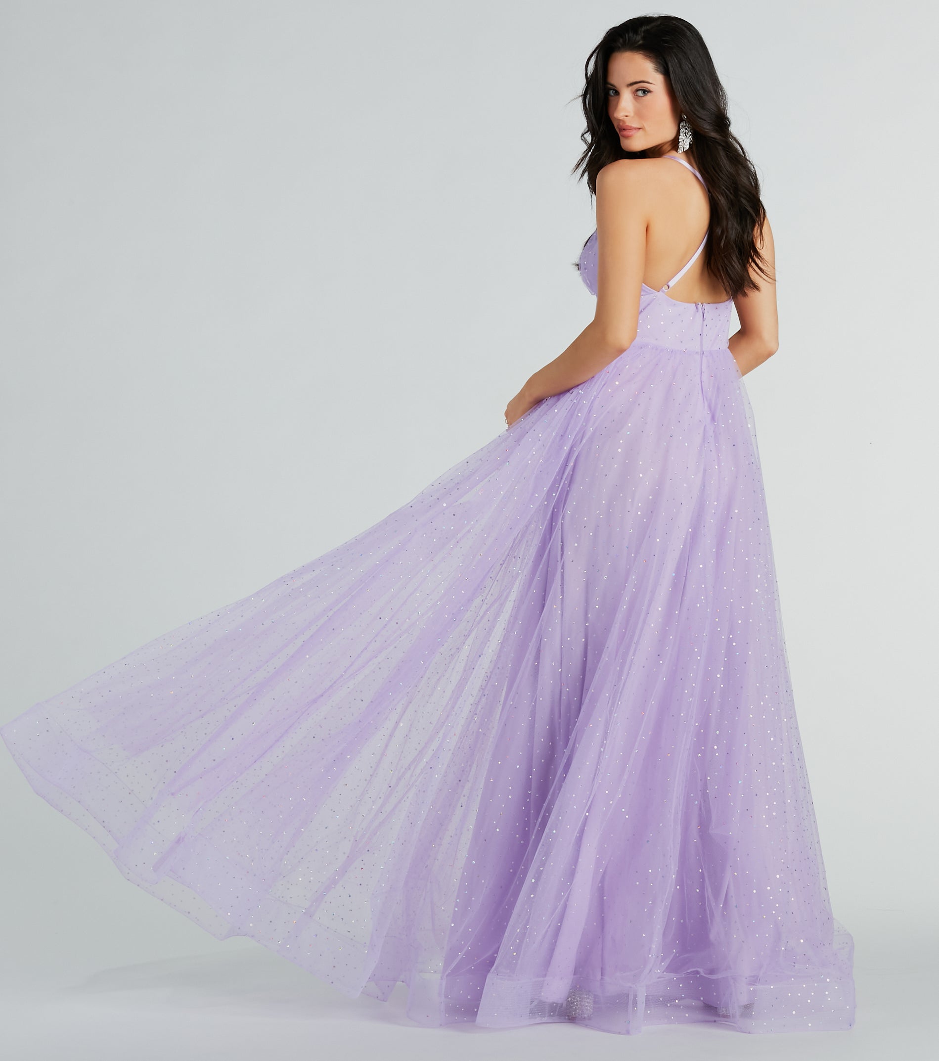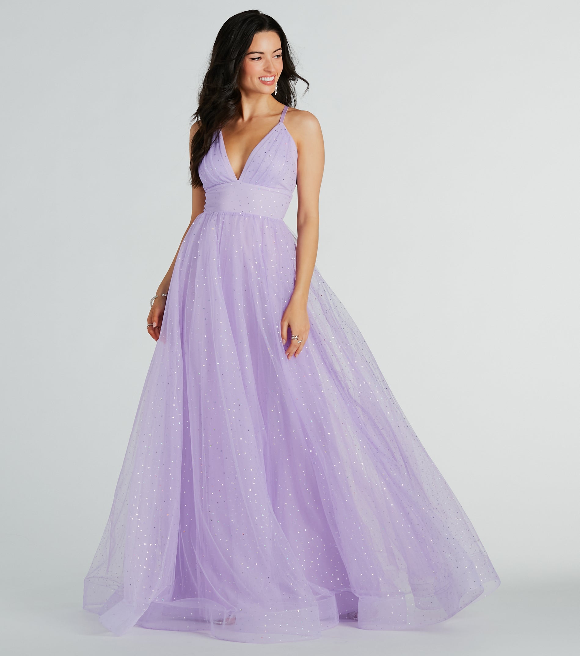 This prom season. you’ll for sure bring that dramatic flair with every step in our glam Vanessa tulle gown! She features a sleeveless plunging V-neckline with pleated detailing at the bust. adjustable spaghetti straps that lead to a cross-back design. a high waist seam. and a floor-length flowy ball gown silhouette. The dress is composed of layers of chic tulle with a knit lining and showcases all-over iridescent sequins for the prettiest sparkle. Style this dress with the perfect pair of .
