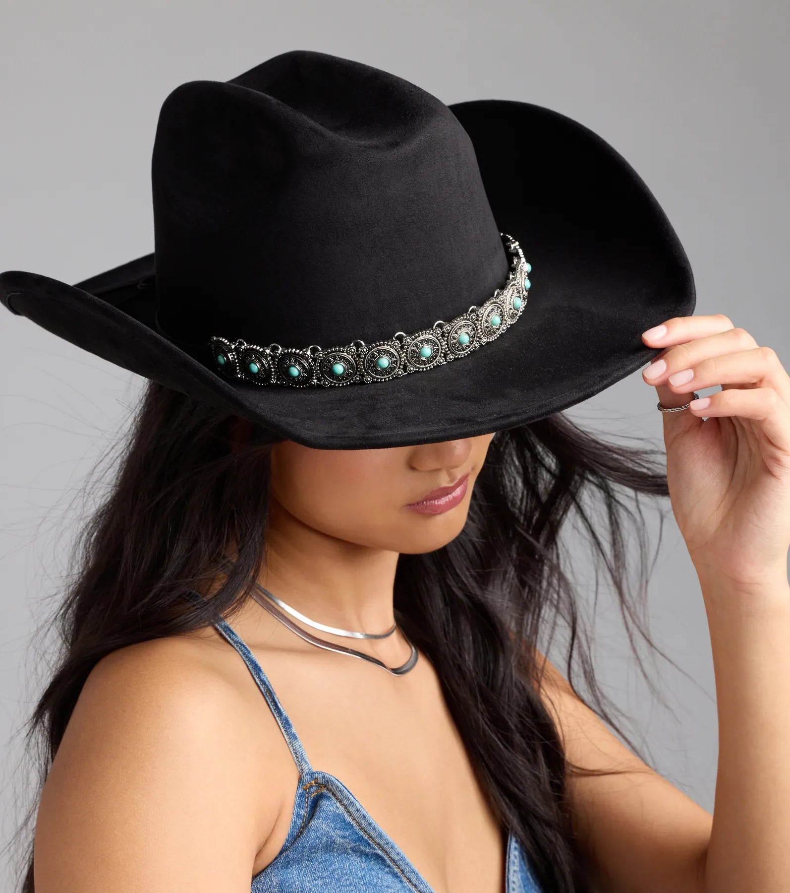 Show up lookin’ like a total western babe with this faux suede cowboy hat featuring a stone embellished metal concho band with a tie-back design.