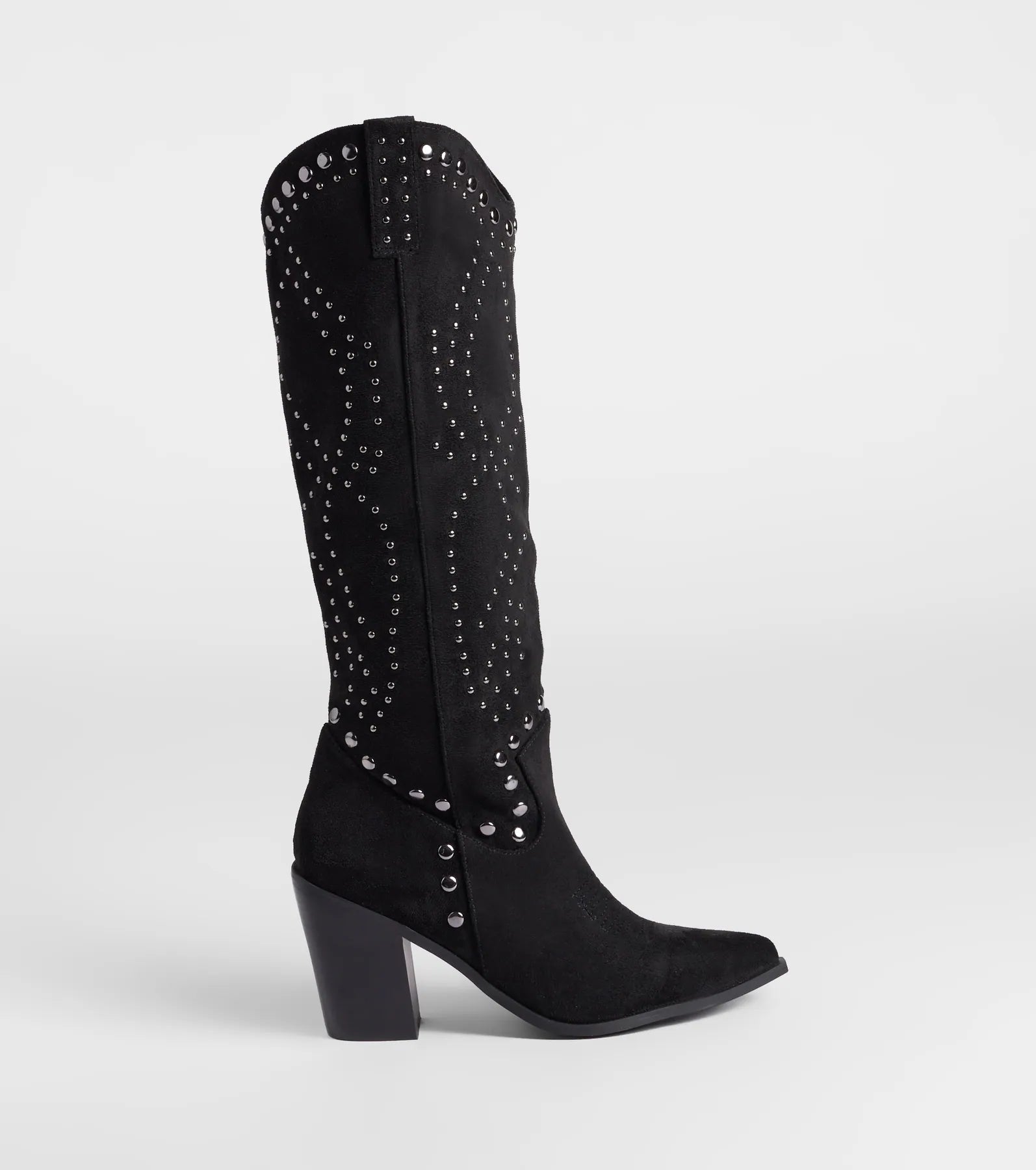 Bring some western edge to your going-out looks with these trendy cowboy boots. Featuring a below-the-knee height. the sleek studded western design will level up your ‘fits.
