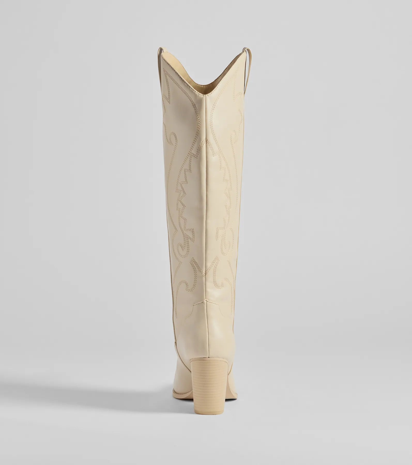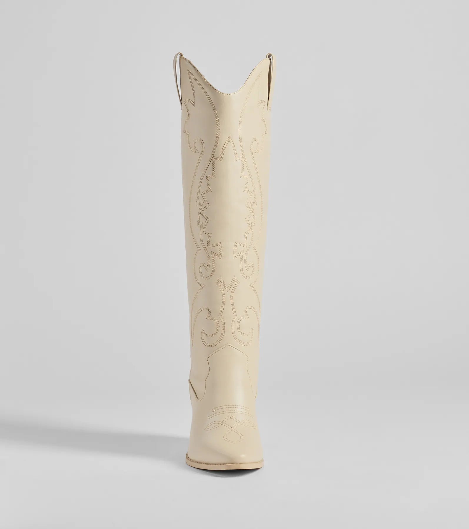 Yeehaw to these fun cowboy boots! With a trendy pointed toe and stacked block heel. these under-the-knee boots feature a western-inspired stitched pattern. Made of faux leather for a comfortable fit that will have you dancing all night long!