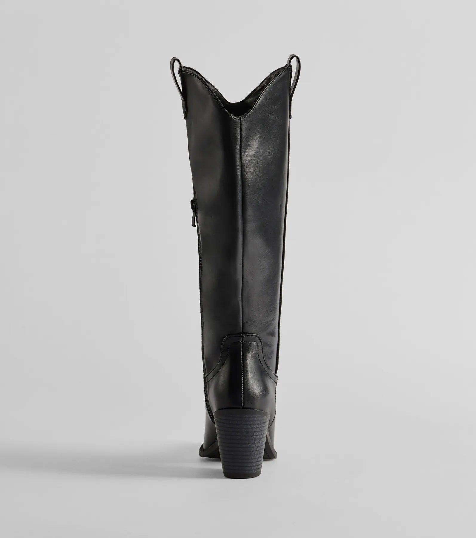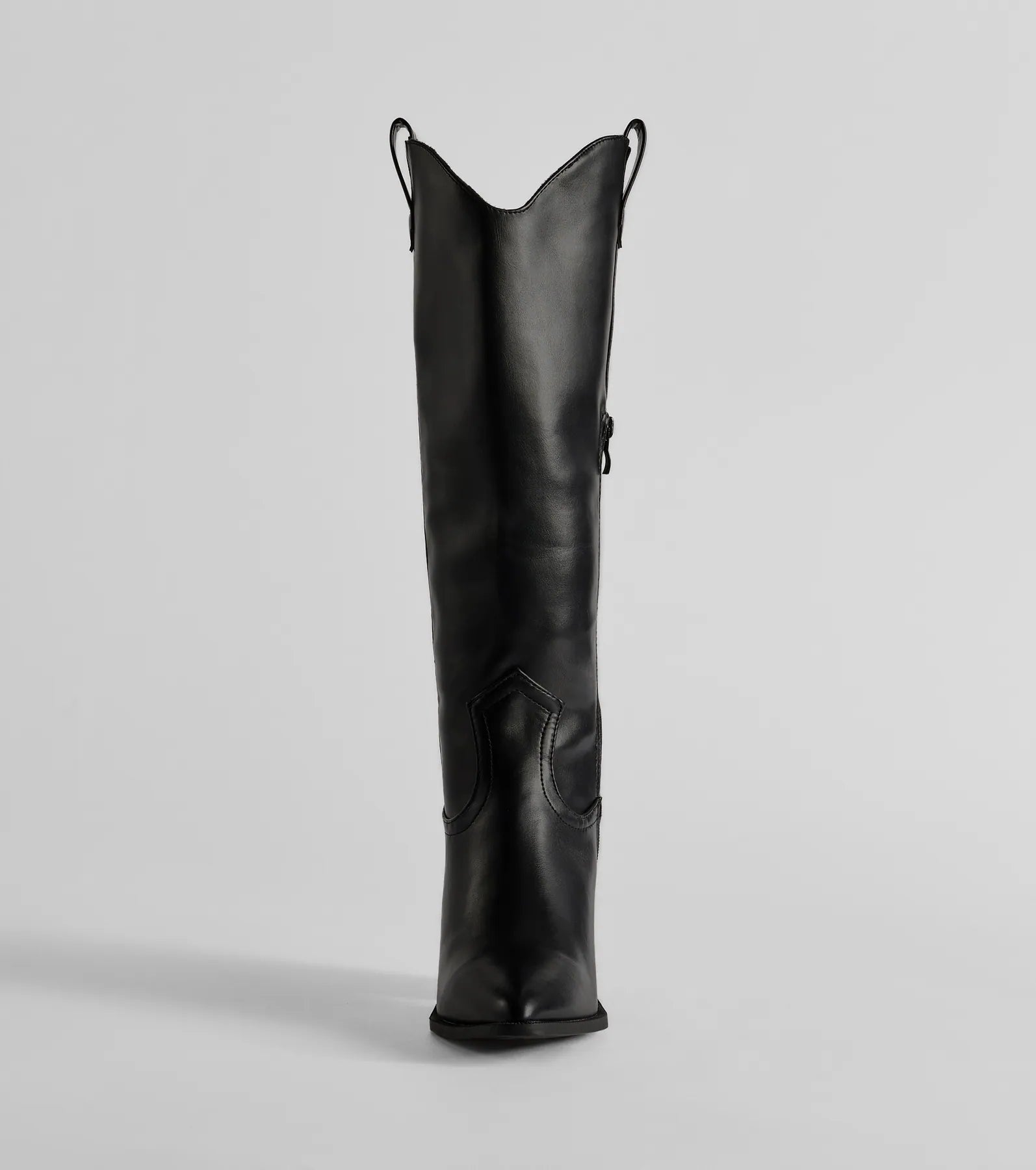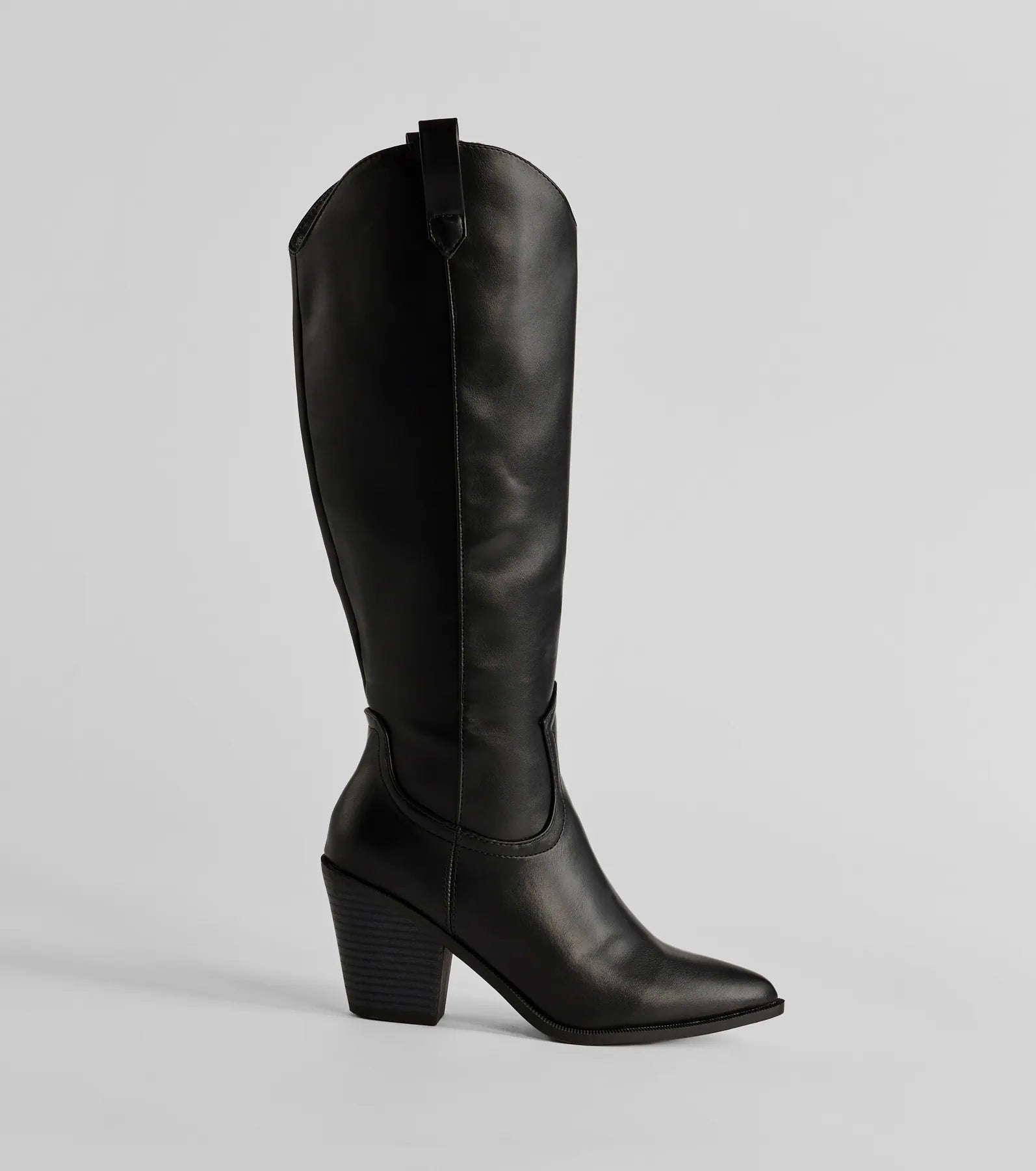 Flaunt your style in western sleek knee-high block heel boots. With a stacked heel. pointed toe. and pull tabs. these boots are your go-to for a chic. confident stride.