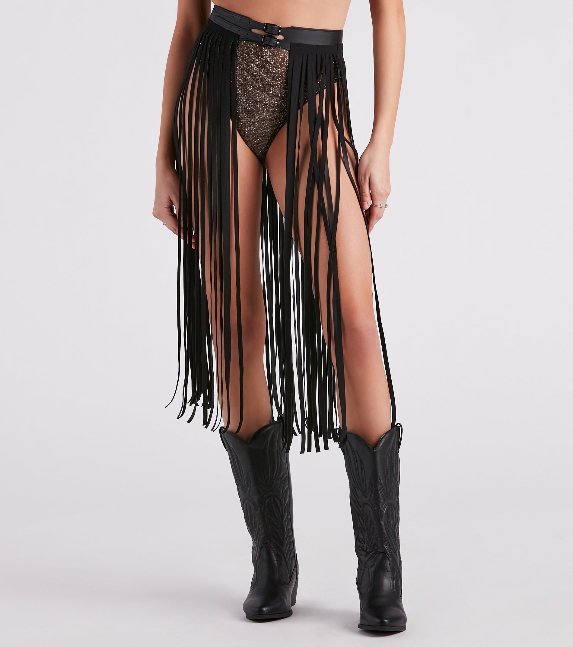 Live it up this festival season with this long fringe belt that brings those wild and free vibes. It features a faux leather waist with dual front adjustable buckles and a long. flowy fringe design at a midi-length hem. Style over a mini skirt or a !