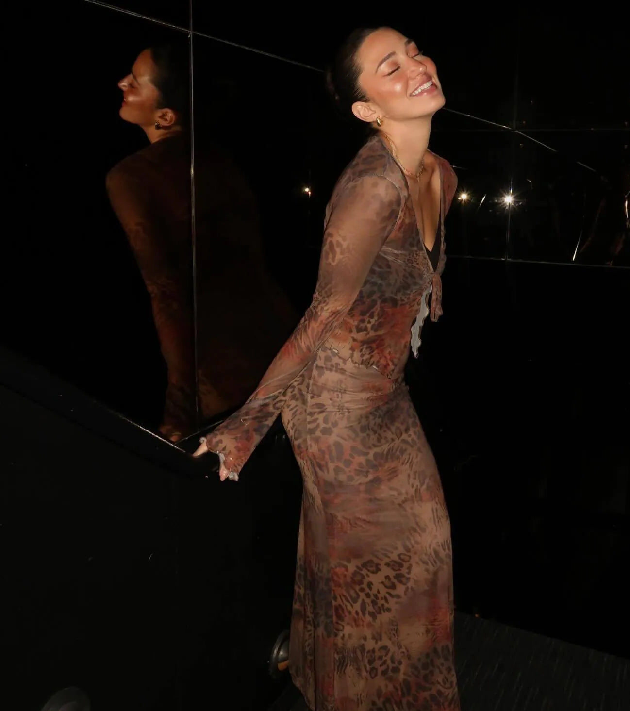 Wildly sultry is exactly how you’ll look in this leopard rose mesh crop top on a night out!  The flared long sleeves and V-neckline with tie closure give a playful touch. while the center slit adds a touch of allure. The cropped length and striking leopard rose print make this top a must-have for any bold fashionista. Complete the look with the matching skirt.