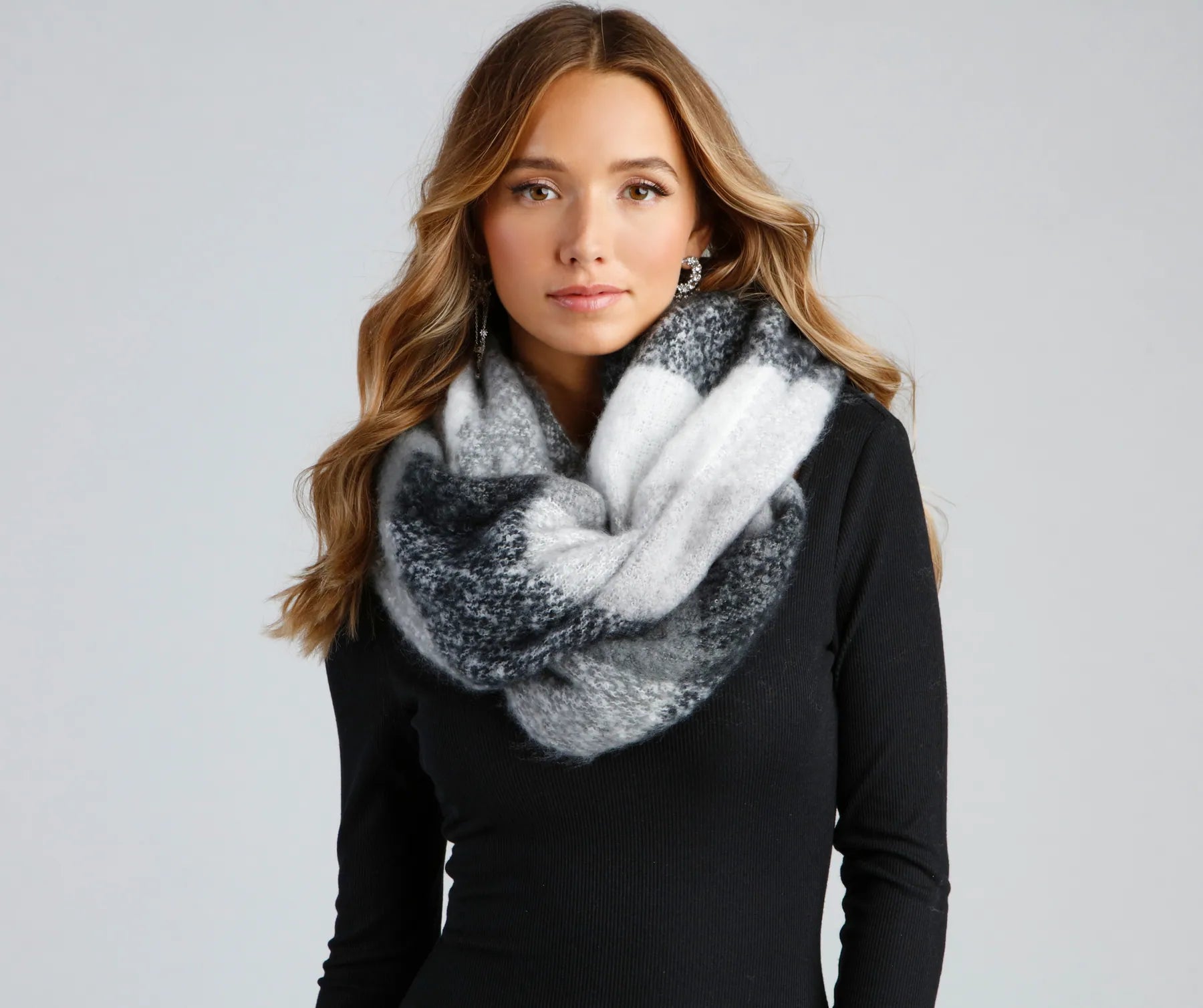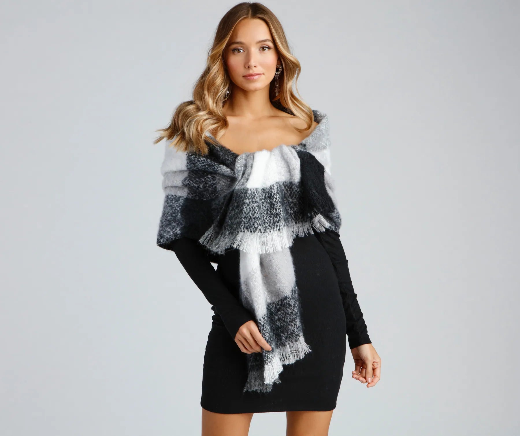Wrap yourself in a cozy scarf that is perfect to layer over your this season! The scarf features a plaid print. an oversized fit. and a noodle fringe hem.?